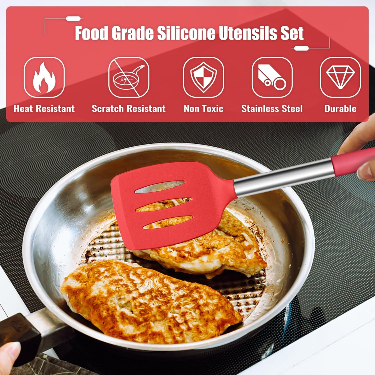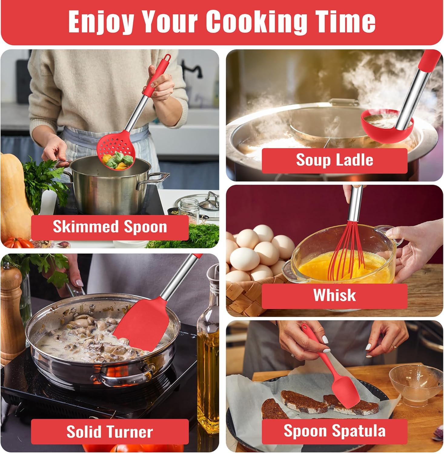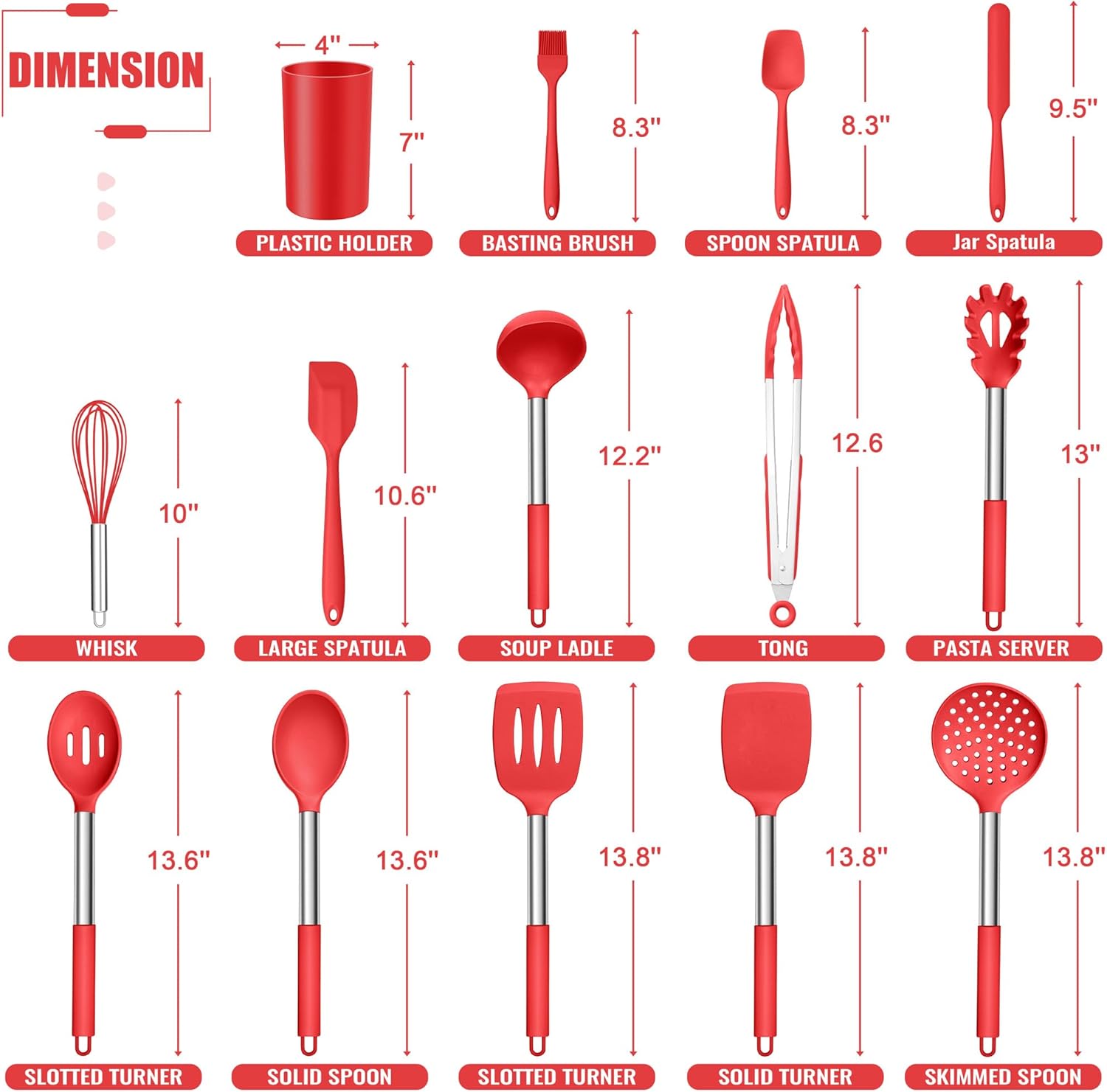 E-far 14 Pieces Silicone Cooking Utensils Set, Kitchen Utensils Set with Holder, Spatula, Ladle, Spoon, Tong, Slotted Turner for Nonstick Cookware, 446°F Heat Resistant & Stainless Steel Handle, Red