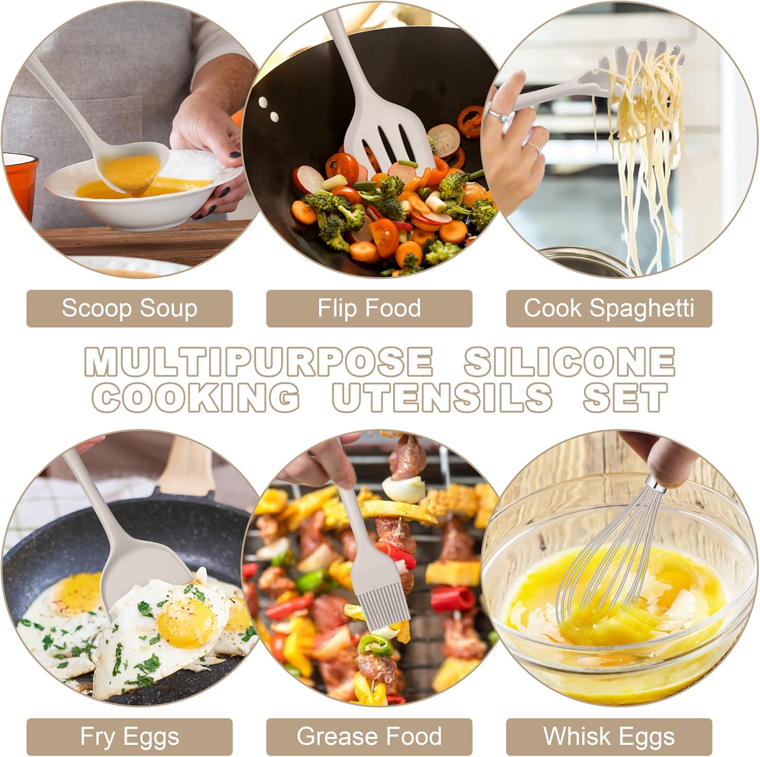FULL KITCHEN UTENSIL SET – Includes slotted spoon, solid spoon, skimmer, spatula, spoonula, pasta server, slotted turner, solid turner, tongs, soup ladle, whisk, jar spatula, brush, plastic holder, 5 x measuring cups, 5 x measuring spoons, All-purpose and essential set makes cooking much easier