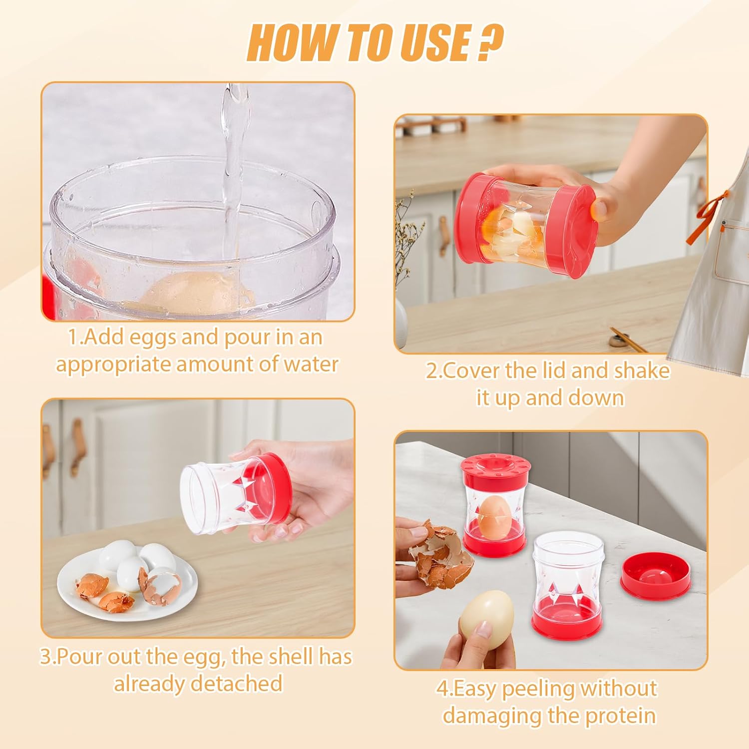 Durable and Safe: Peel hard boiled eggs easily is made of two materials: Pp lid and gpps body, which is not easy to deform or crack. At the same time, the size of egg peeler tool for hard boiled eggs is only 3*3*3.84 inches, which is small in size. Whether it is placed on the kitchen countertop or in the storage cabinet, it will not take up too much space, allowing you to easily organize and store it.