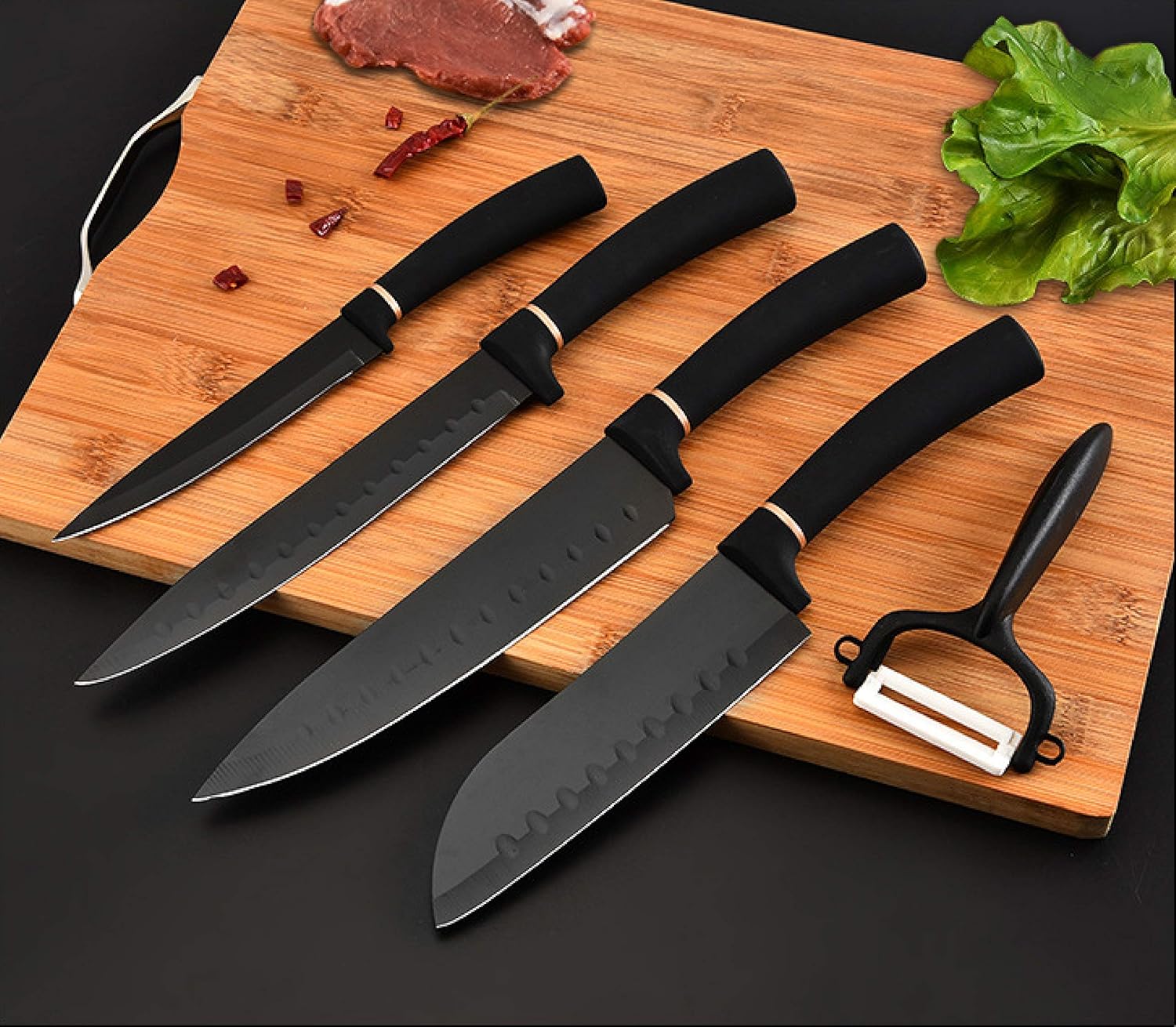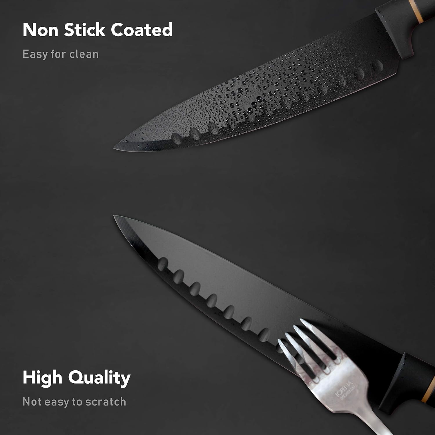 Sharp and Durable – Designed from 3CR13 high quality stainless steel, the whole knife set is amazingly hard and strong; With Non-stick black coating, the knife can clean easily and reduce the chance of food sticking over the blade.