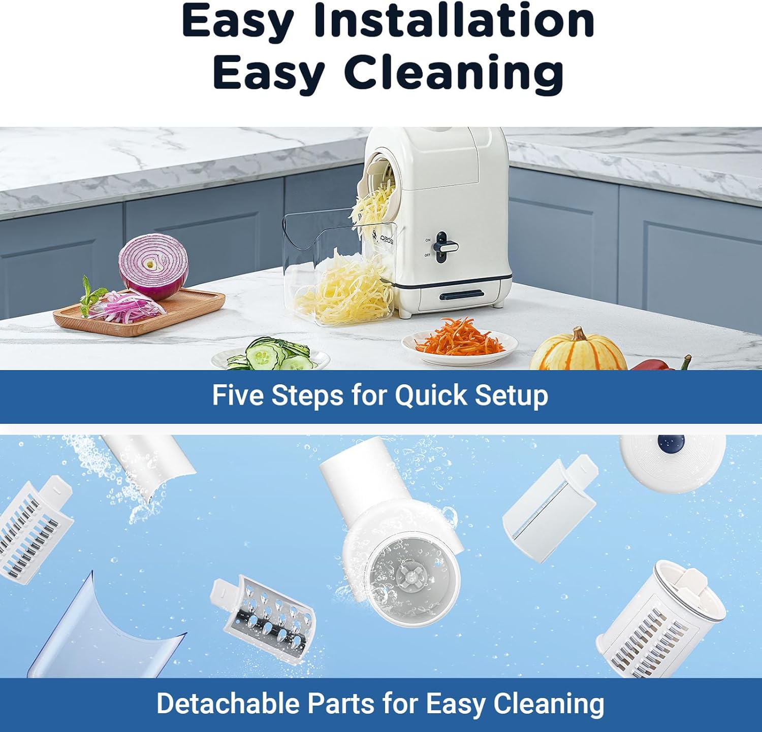 𝐄𝐚𝐬𝐲 𝐭𝐨 𝐂𝐥𝐞𝐚𝐧 𝐚𝐧𝐝 𝐌𝐚𝐢𝐧𝐭𝐚𝐢𝐧: Bid farewell to tedious cleaning tasks! Our vegetable slicer electric features a detachable design that prevents food residue buildup, ensuring optimal hygiene with minimal effort. NOTE: If there is vegetable pigments in the housing of the slicer/shredder attachment,a drop of edible oil is of great help to clean thoroughly