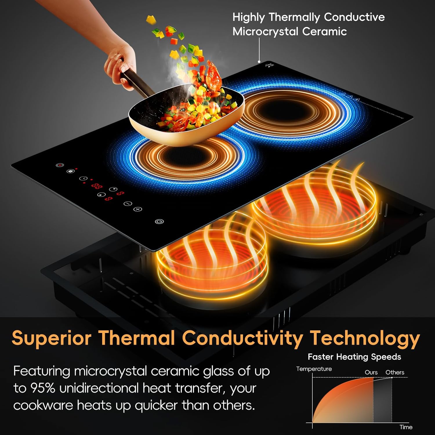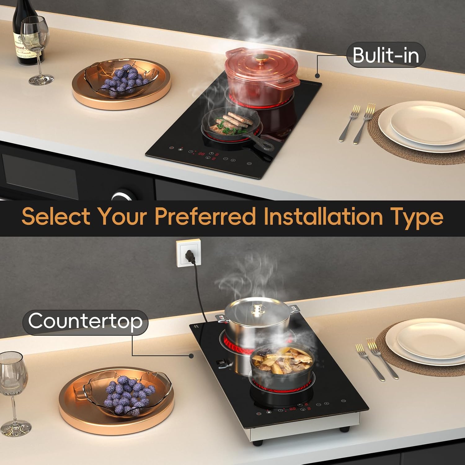 [Zarbaco Electric Cooktop – Power and Efficient Combined]: Cook with confidence and style with the Zarbaco 2 burner electric cooktop, featuring a powerful 1800W total output, featuring 9 adjustable power levels, with one burner at 1600W (800W+800W) and another at 1000W, this electric stove top burner ensures fast and efficient cooking, perfect for family gatherings like birthdays, Christmas, and Thanksgiving.