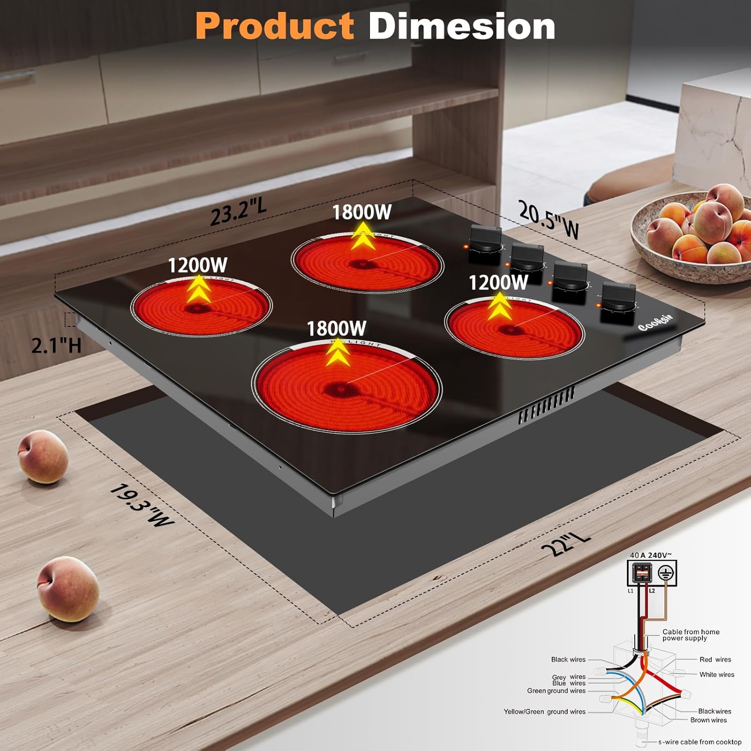 【4 Powerful Cooking Zones】This 24 inch electric cooktop is suitable for AC220-240V, featuring 4 different cooking zones with total power 6000W. The two 6.5″(165mm) round cooking zones have a maximum 1200W power, the two 7.9″(200mm) round cooking zones have a maximum 1800W power. Built-in Ceramic Hob 220-240v hard wired, need a professional electrician for wiring.
