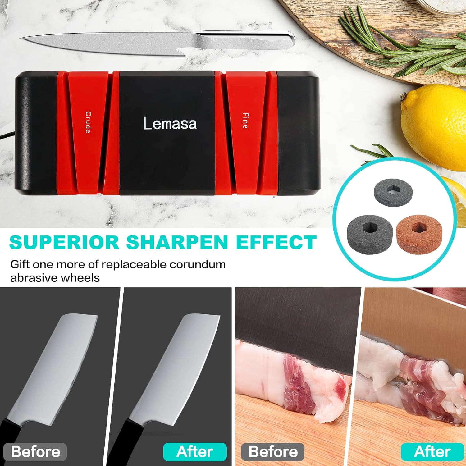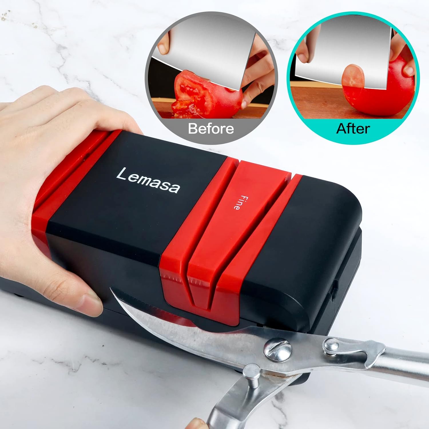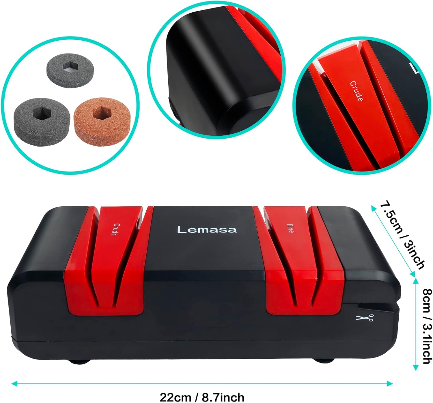 Lemasa electric knife sharpener is designed for home and kitchen, you can sharpen dull knives and scissors to the more sharp a short time, give you a good sharpening experience. More convenient and fast than sharpening stone and manual sharpener, saving your time