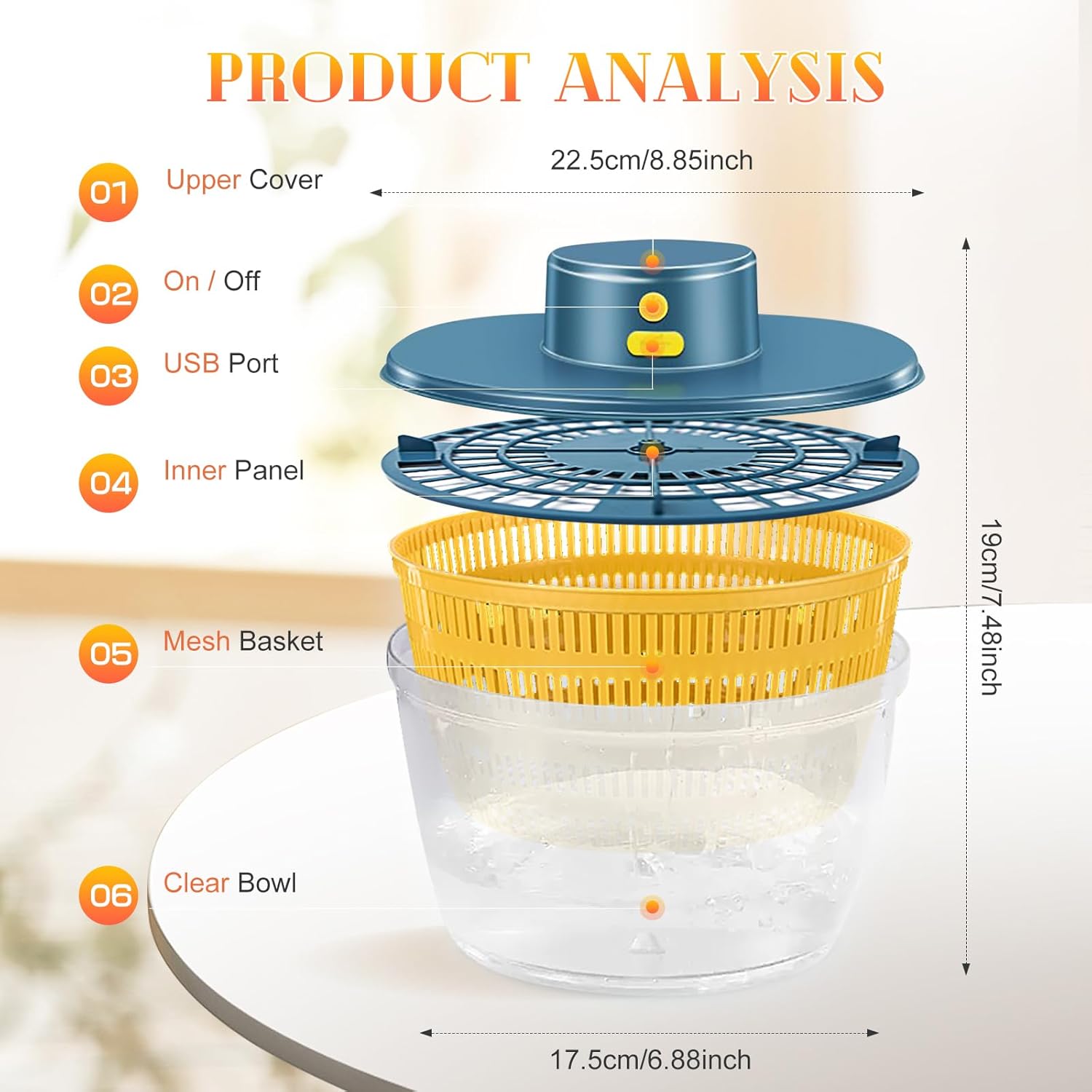USB fast charging, can be used more than 100 times after fully charged. One button start, 10 seconds draining, efficient and simple, effectively prevent oil splash when cooking. It allows you to dry vegetables and fruits faster and more efficiently, and take your salad making to a higher level.