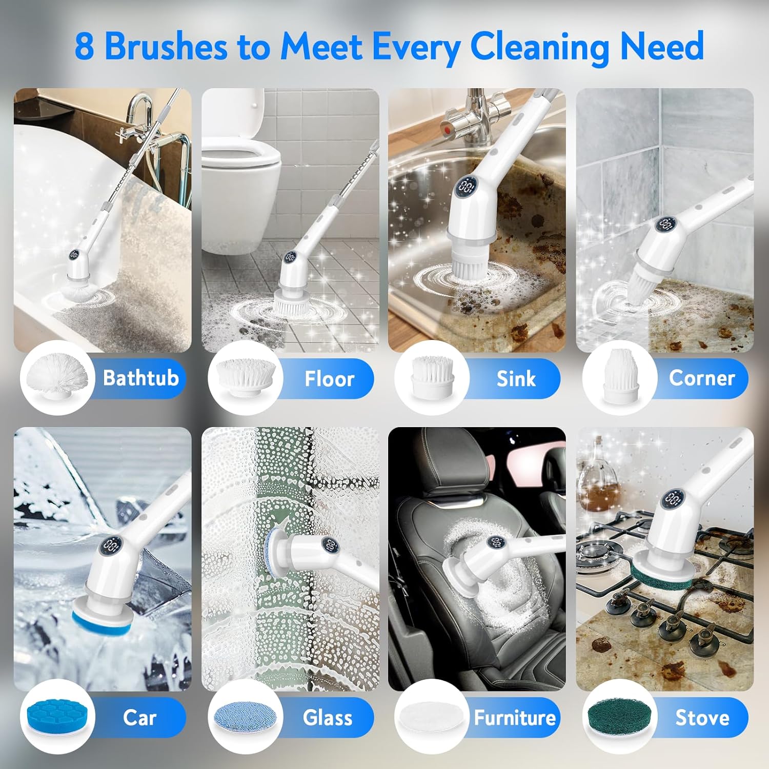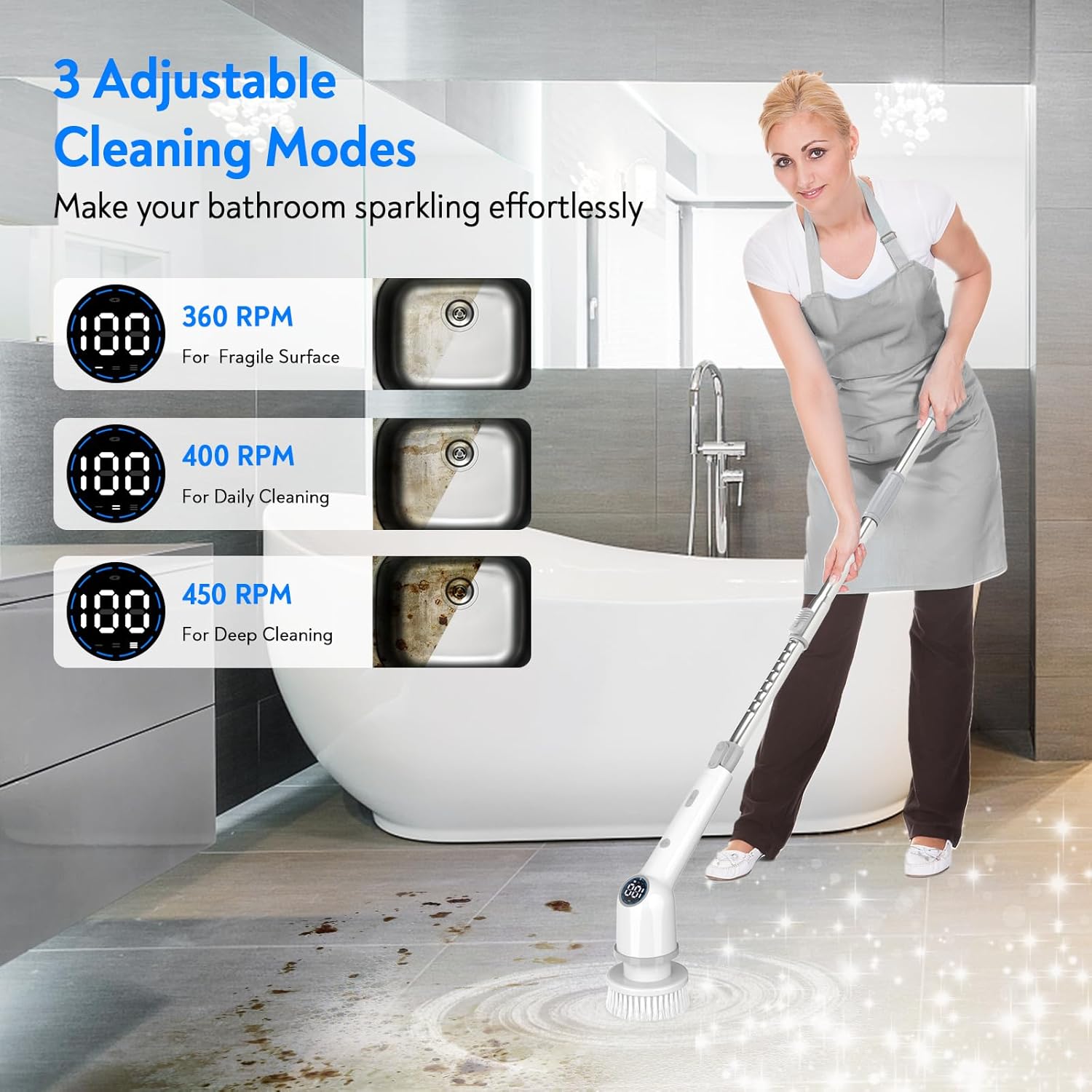 Electric Spin Scrubber, Cordless Bathroom Scrubber with 8 Replacement Heads & Detachable Extension Arm, Shower Scrubber 450RPM with Triple Speeds, 120Mins, Cleaning Brush for Bathtub Tile Floor