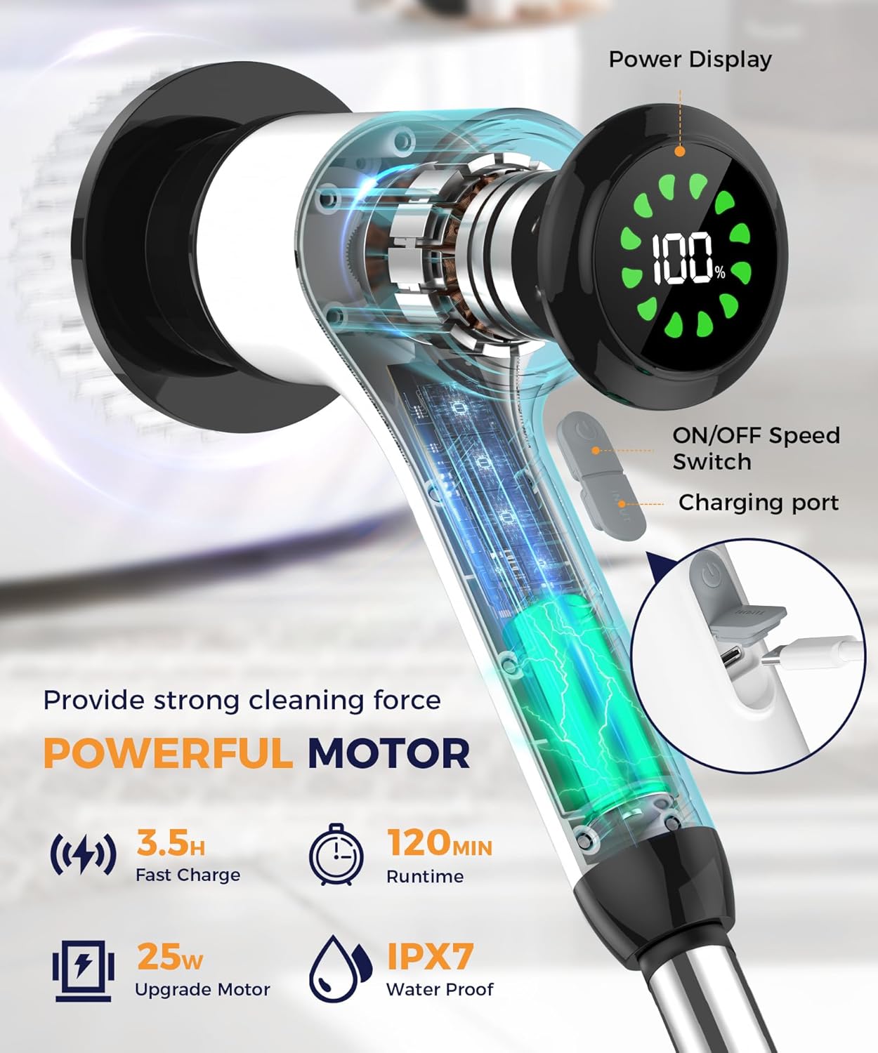 Cordless Cleaning Brush, Ultra long-lasting: This cordless shower scrubber features a large battery The cordless design allows you do cleaning with the most relaxed posture.