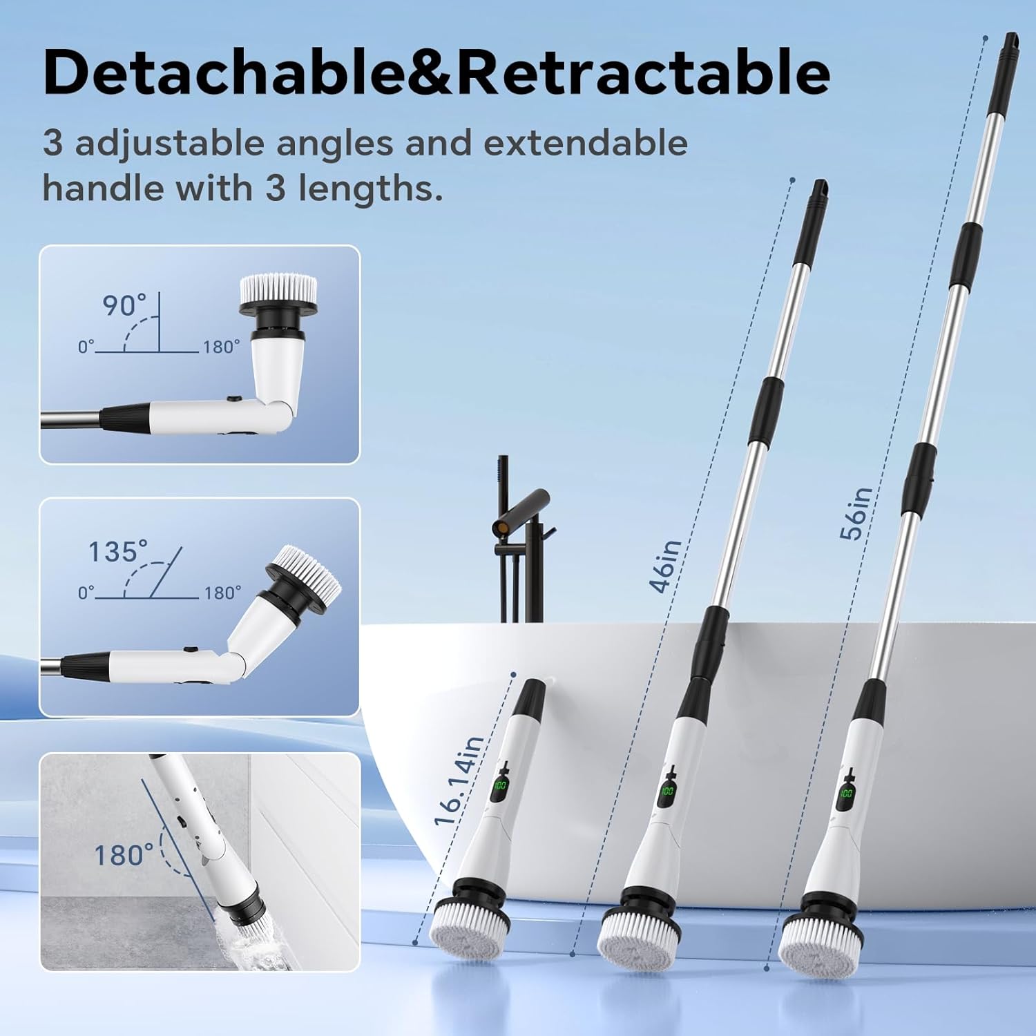 3 Adjustable Angle and Handle Size:The electric shower brush features a head with 3 adjustable angles (90°,135°,180°) for easier cleaning without bending over.Its 56 inch extendable handle allows you to reach high place and walls without needing a ladder