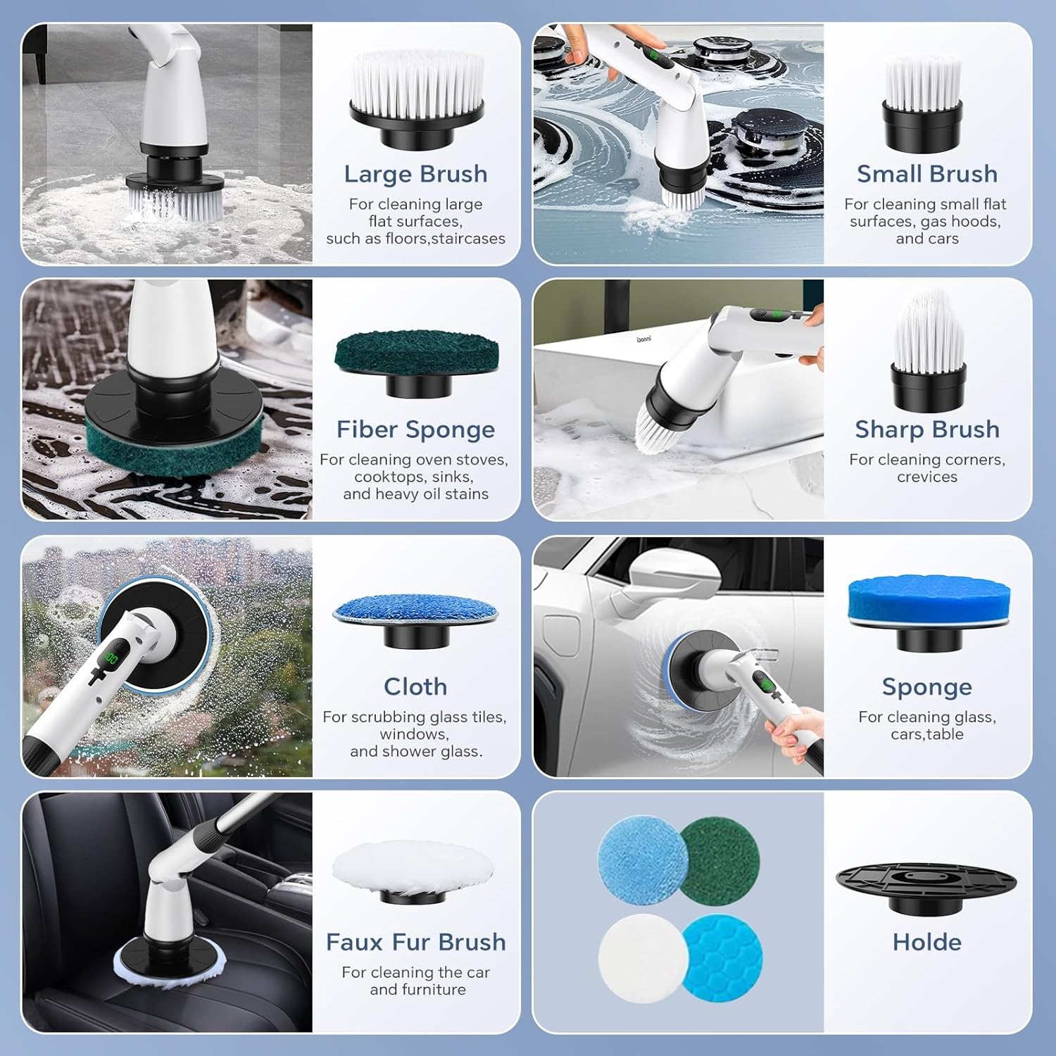 7 Brush Heads for Versatile Cleaning:7 versatile brush heads for various cleaning tasks.A large brush works for bathtubs,small brush for cars,corner brush for hard-to-reach areas,sponge brush for car windows,etc,covering all your daily cleaning needs