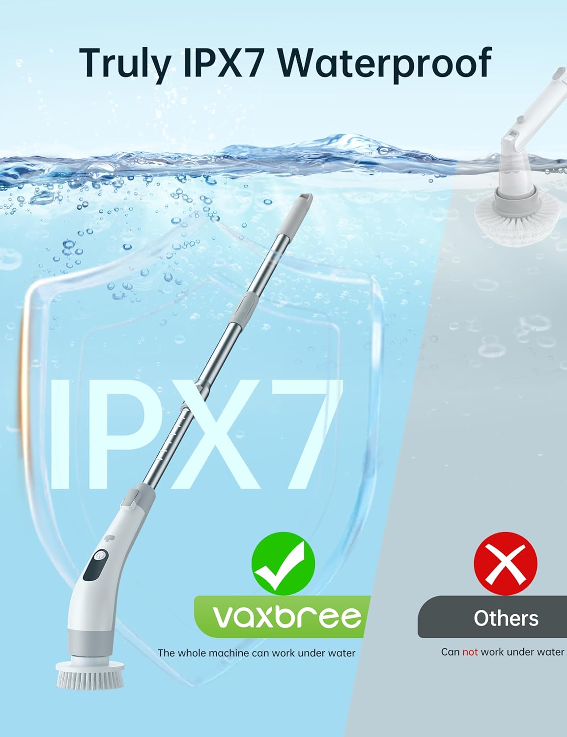 WIDE RANGE OF BRUSH HEADS FOR ALL SURFACES: The shower scrubber comes with eight different brush heads, providing you with versatility to clean various surfaces efficiently, from bathtubs to tiles, cars, kitchenware, stove, window, sink, corners and more, this scrubber is versatile and reliable. Say goodbye to tiresome scrubbing and hello to effortless cleaning with Vaxbree Electric Spin Scrubber.