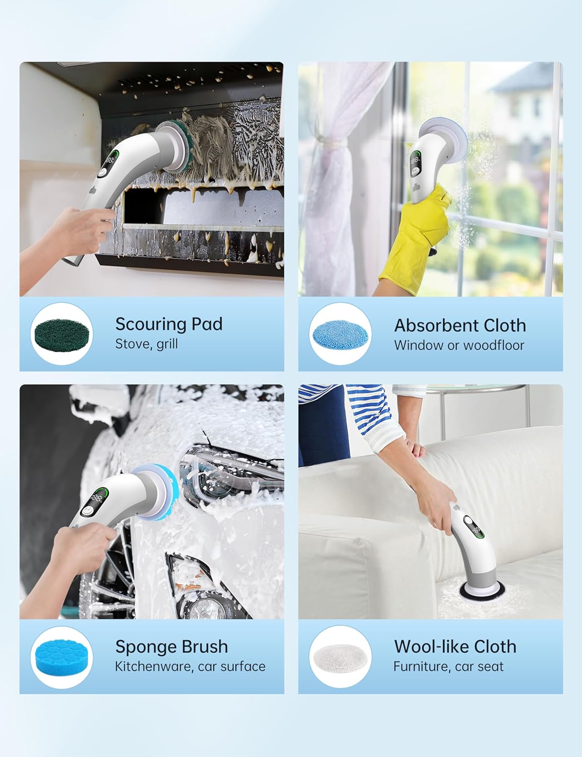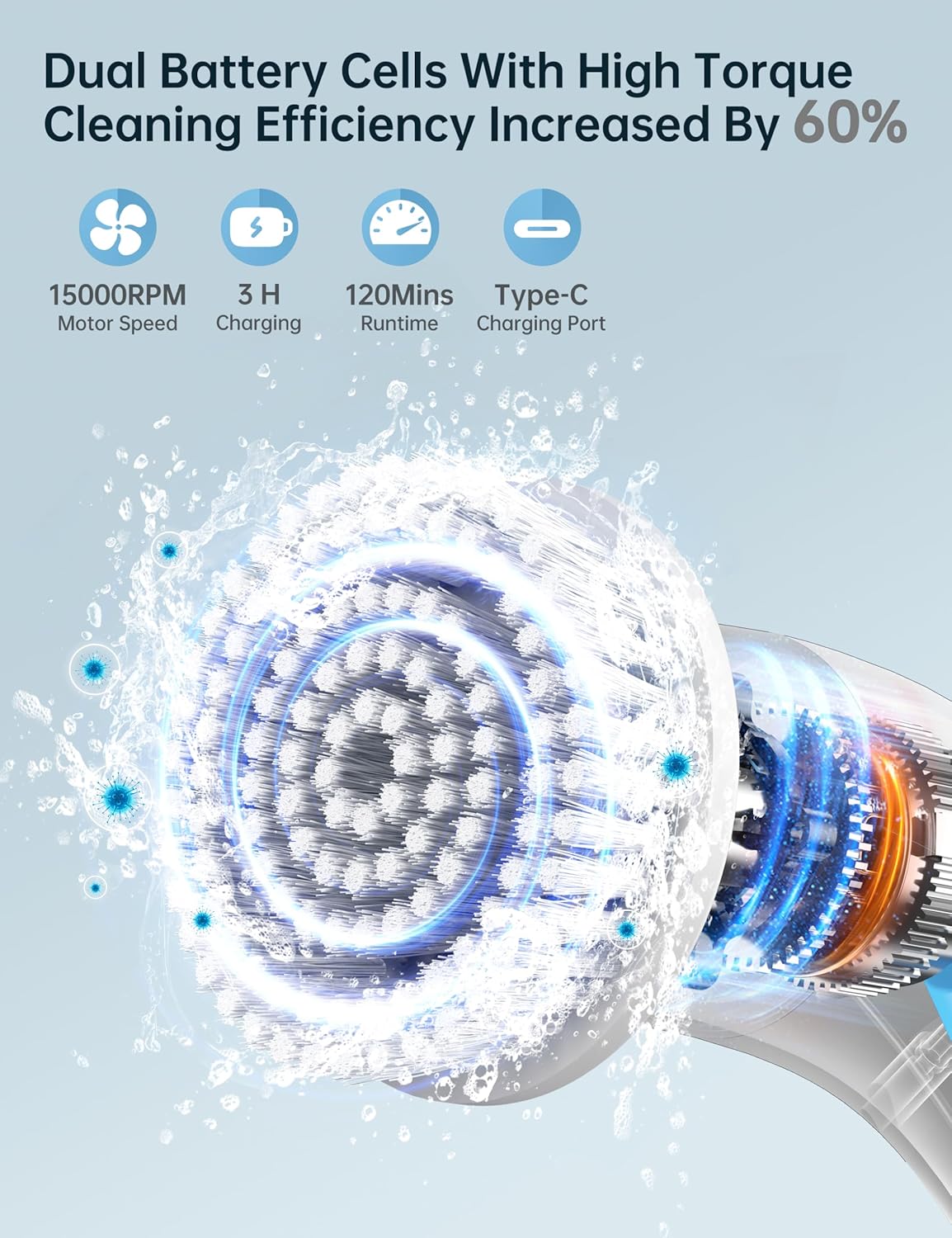 TWO CLEANING MODES & 120 MINS RUNTIME: With two adjustable speeds, you can customize the intensity of the scrubbing action. Whether you need gentle cleaning or powerful scrubbing, this power scrubber has got you covered. Dual battery cell provides 120 Mins working time at Min mode and 90 Mins at Max mode, giving you ample time to tackle even the toughest cleaning tasks. The power scrubber provides extended usage without the need for frequent recharging, making it ideal for larger or more demanding cleaning projects.