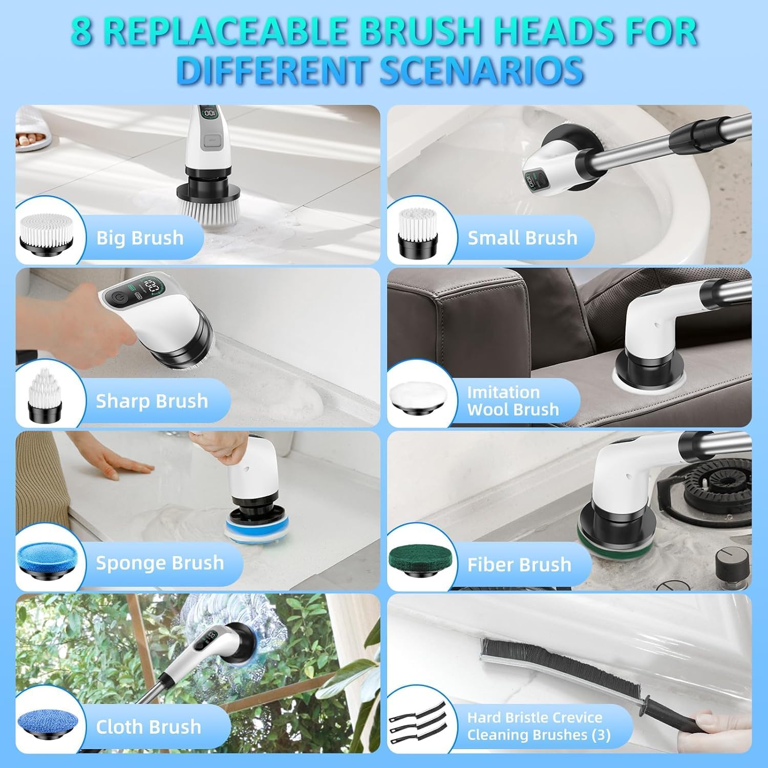 Multi-Surface Efficiency: Our scrub brushes for cleaning set includes 7 interchangeable heads, including 3 stiff-bristle brushes for crevices, to meet a wide range of cleaning needs. Perfect for use in the bathroom, kitchen, toilet, walls, tiles, windows, and more.