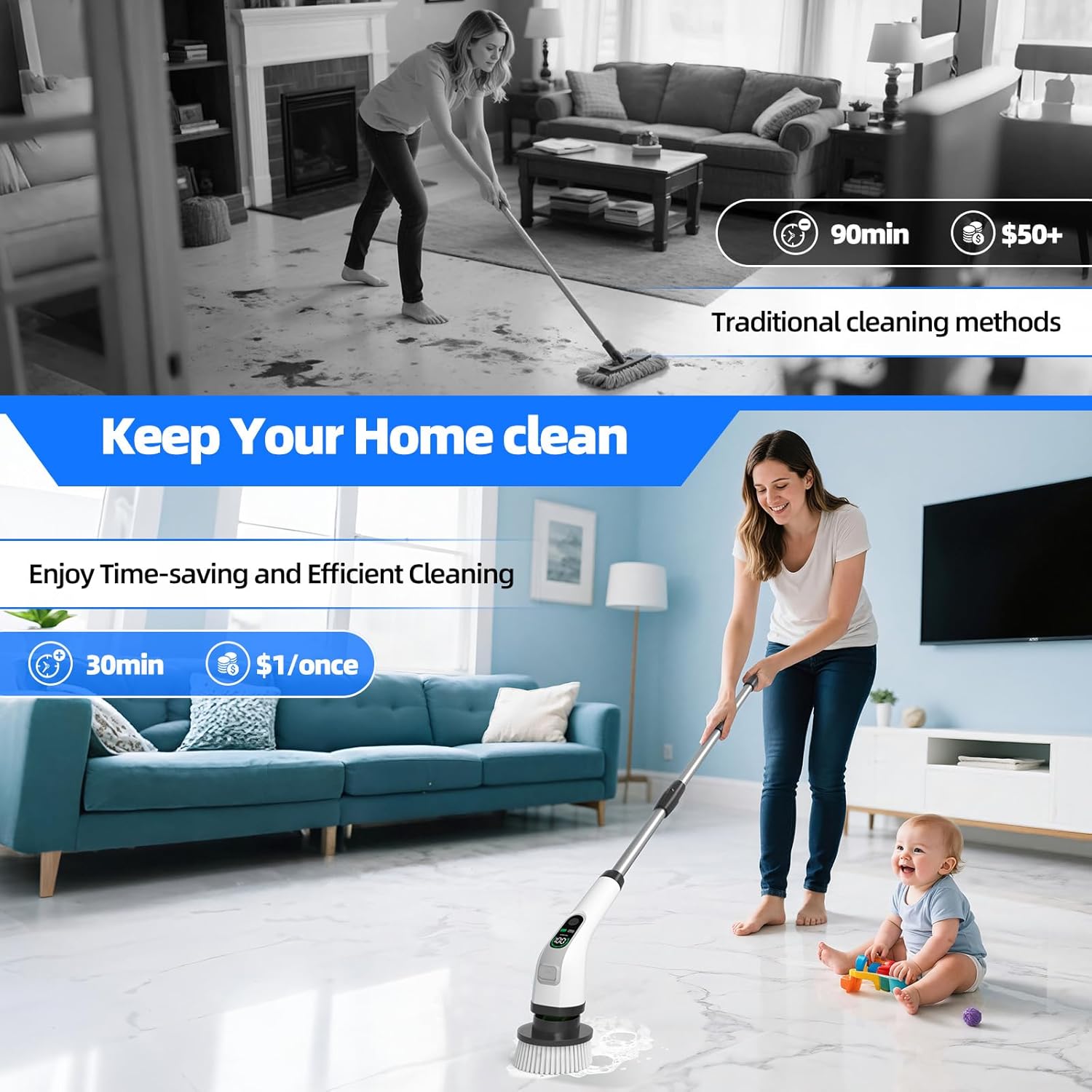 Power Cleaning Brush: Discover the power of electric rotary floor scrubbers for an unparalleled cleaning experience. Its fast-spinning mechanism effectively removes built-up dirt without scratching surfaces, leaving a brilliant shine. Say goodbye to traditional cleaning tools and enjoy an easier, stress-free cleaning routine.