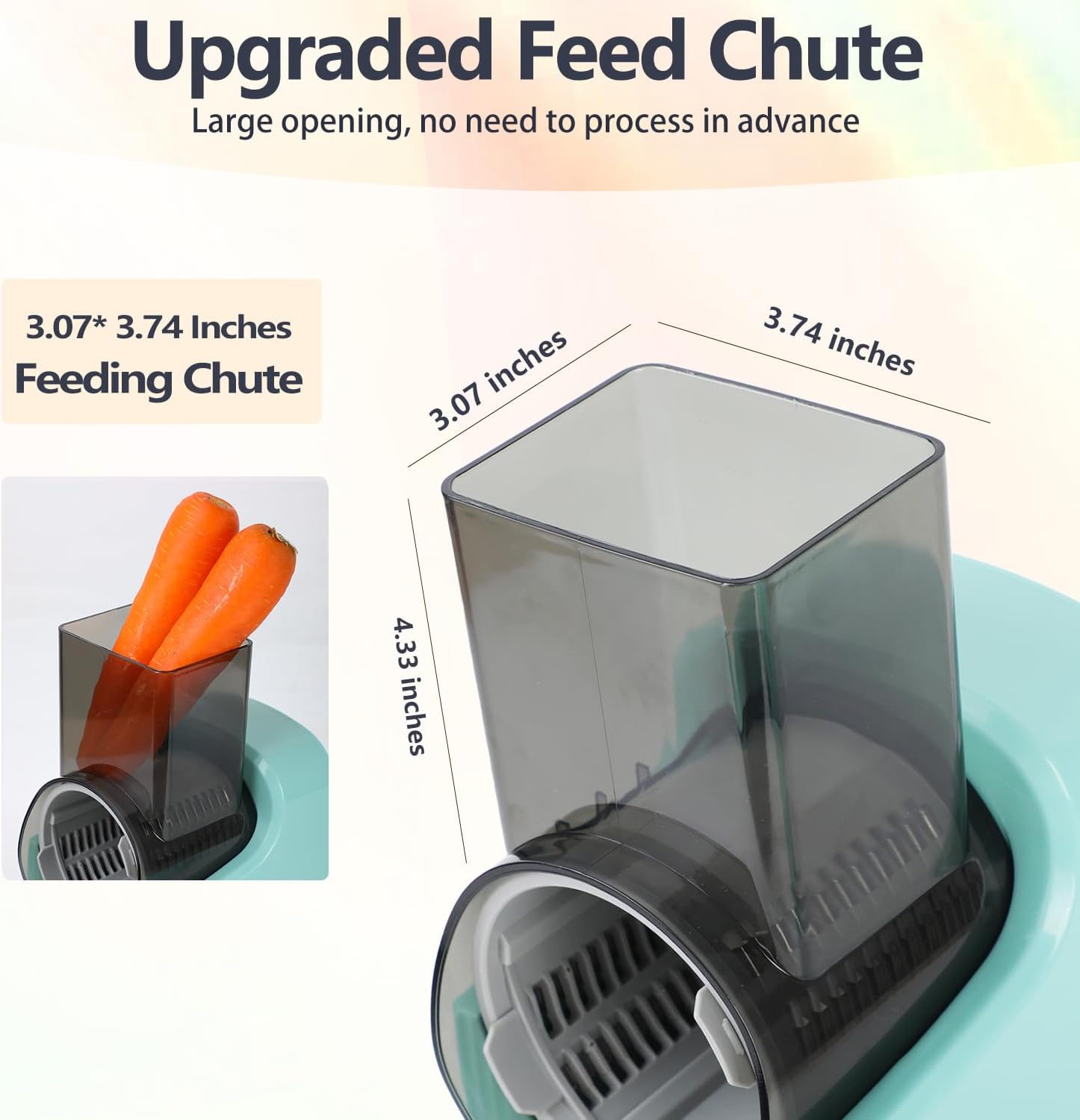 Easy to Clean: Cleaning is a breeze with the electric salad shooter, it adopts a detachable design. The top food chute is removable and dishwasher safe with warm water. The main body should be wiped clean with a dry cloth to avoid moisture entering