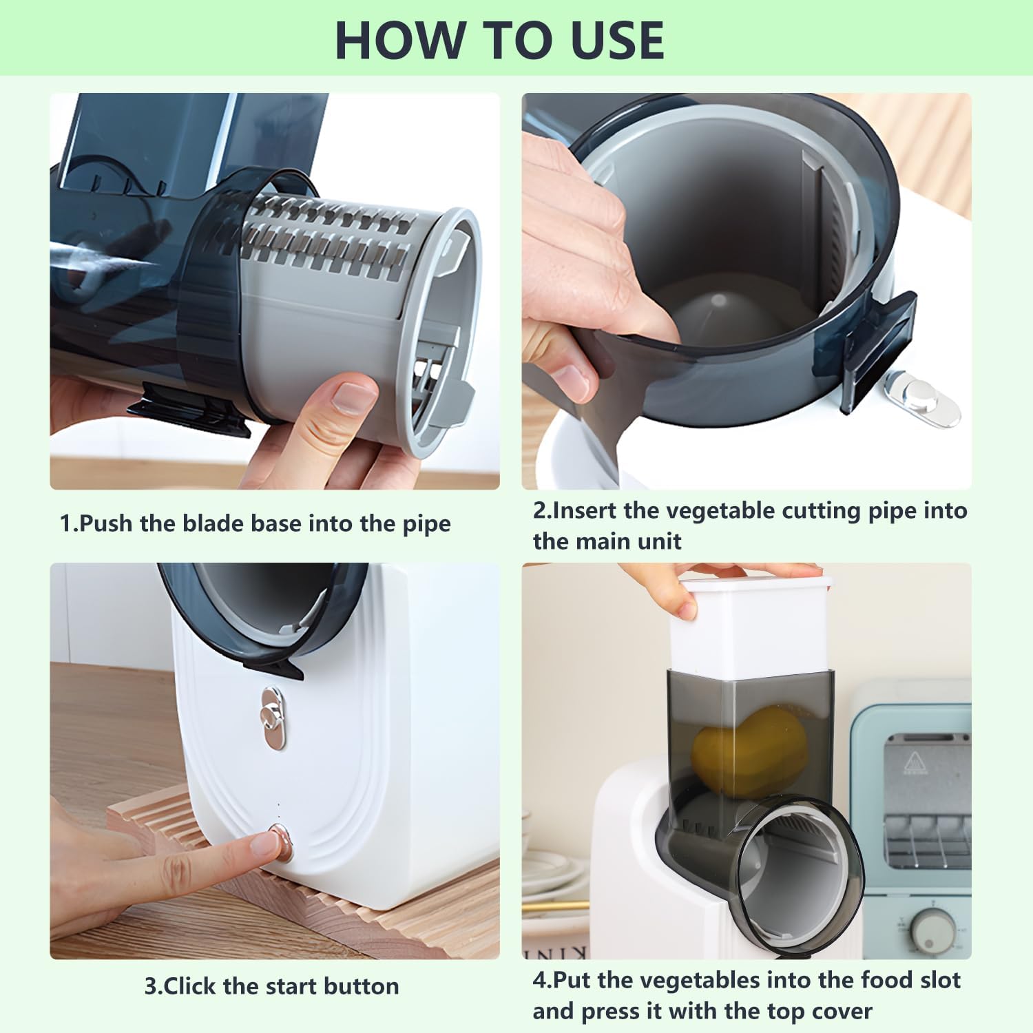 Multifunctional Slicer: Effortlessly slice and shred with our electric vegetable slicer. Multi-function vegetable slicer can easily handle vegetables like carrots, potatoes, cucumbers,etc. For best results with cheese, refrigerate to harden before slicing
