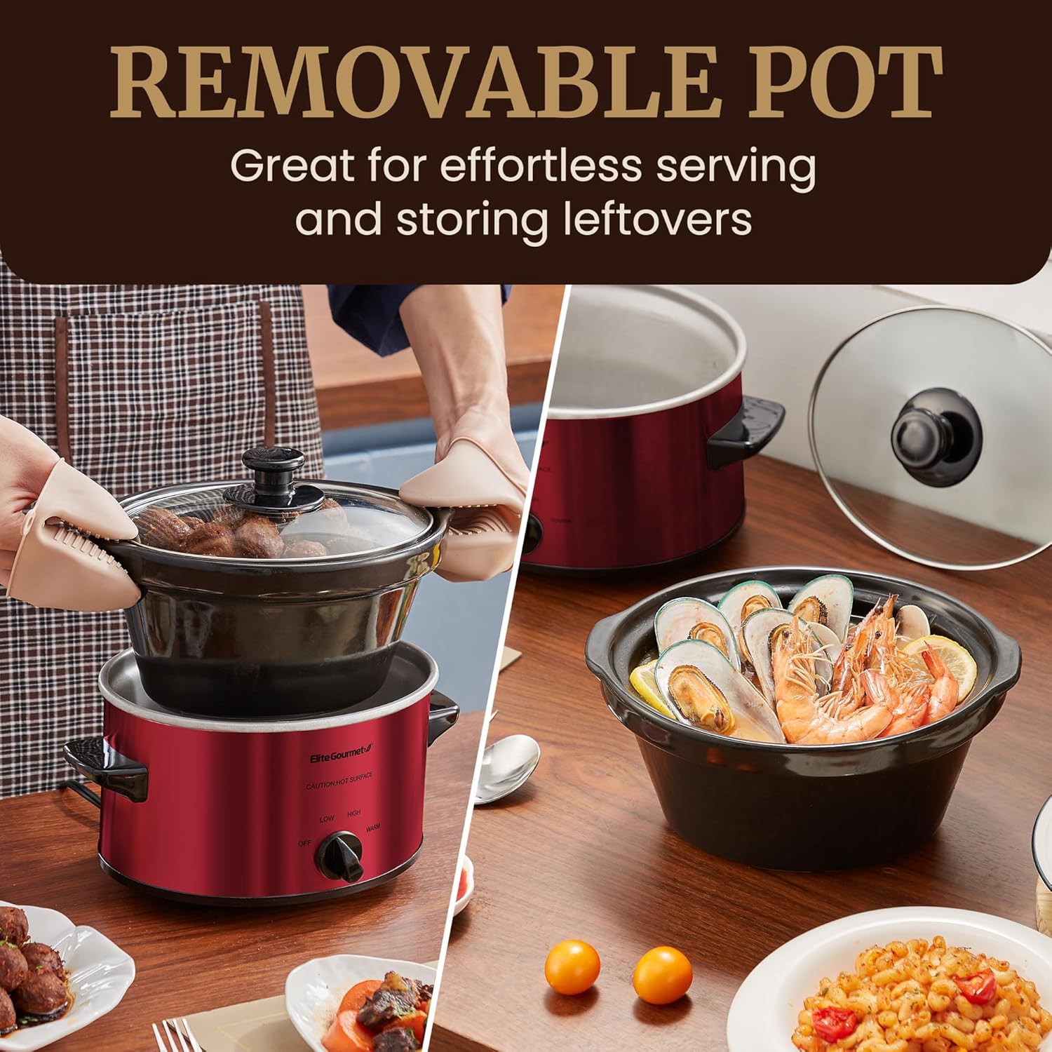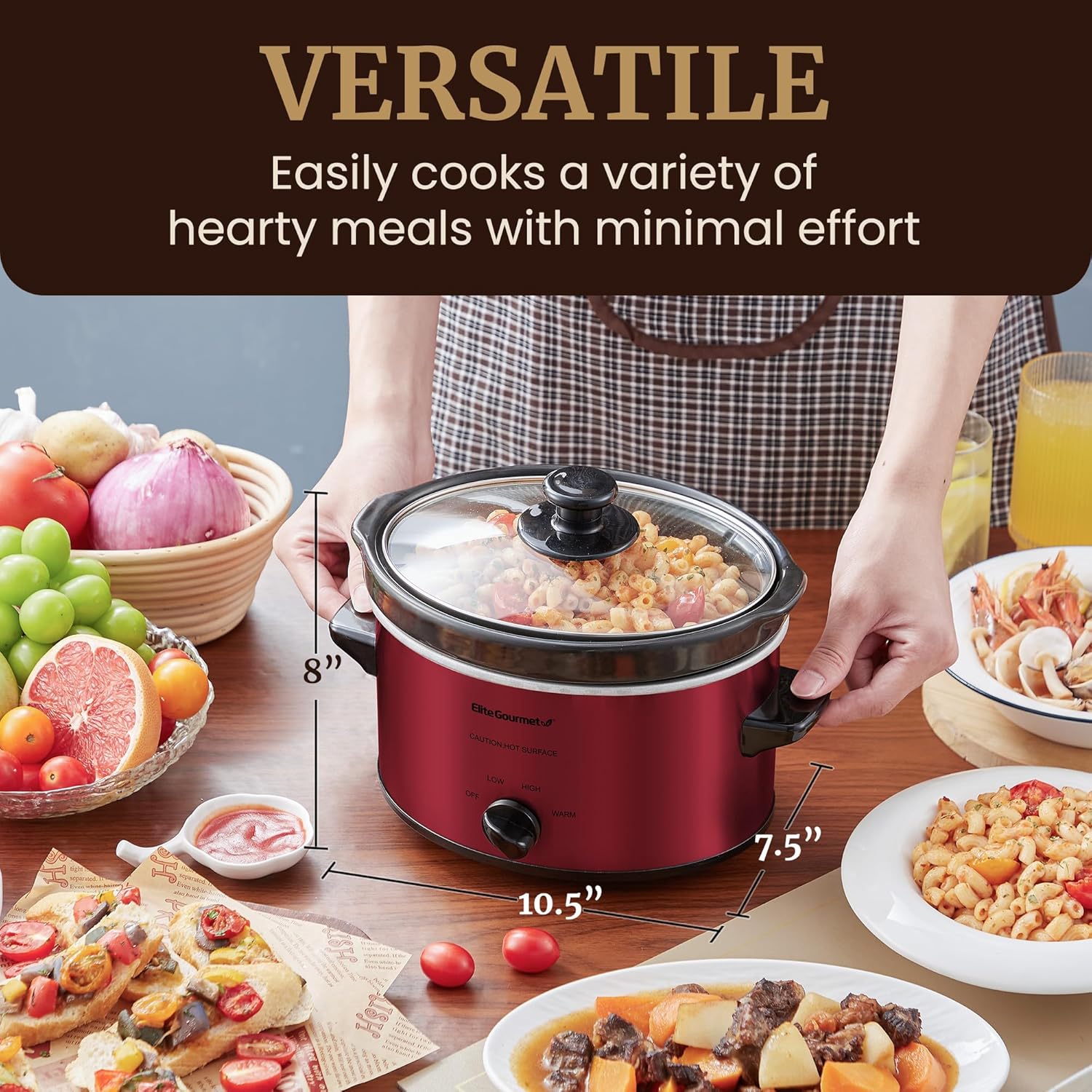 The Elite Gourmet 2 Quart Slow Cooker is the perfect appliance for cooking and serving meals for a small family. It features defrost, low and high temperature settings perfect for making chili’s, stews, sauces and even a 2 lb. chicken or roast and, with an attractive red stainless steel finish, it’s the perfect addition to any kitchen! It includes a removable inner stoneware pot that’s easy to clean, a tempered glass lid with metal rim for easy viewing and cool-touch handles and knob for safe handling.
