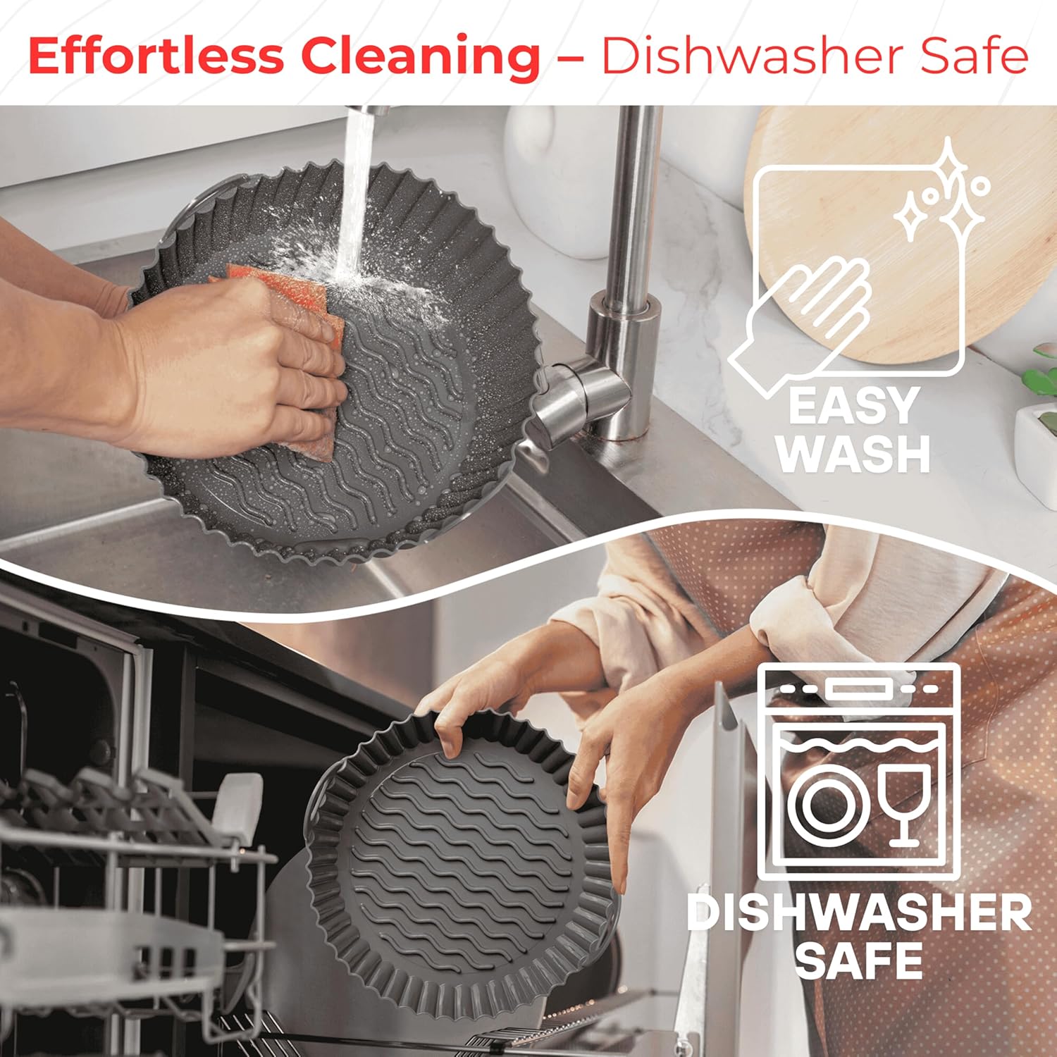 Advanced Grooved Design: The raised ridges of our silicone reusable airfryer liners improve hot air circulation, channel away excess oil, and deliver crisp, even cooking results, while protecting your fryer basket from stubborn residue.