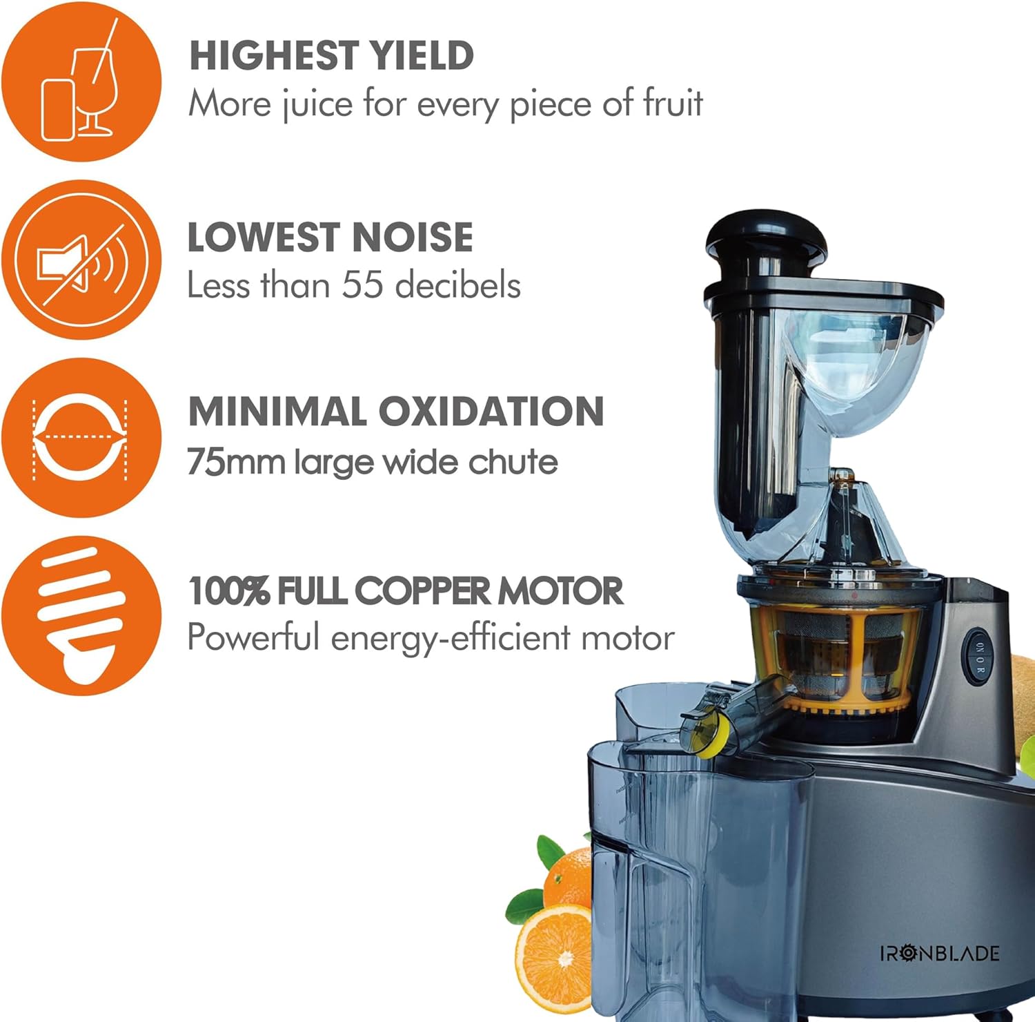 75mm Wide Chute for Convenience: Features a large feed chute, reducing the need for pre-cutting fruits and vegetables, making juicing faster and more efficient.