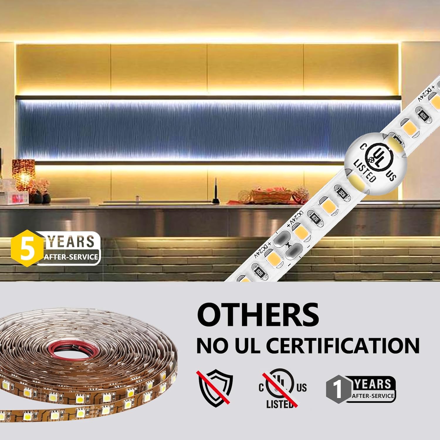 Quality Control, Performance: Double Sized PCB width 8mm, SMD2835 Led Strip Lights in 600 Led Lengths; Cuttable every 1.97”, 32.8ft (DC 24V) max run without voltage drop.