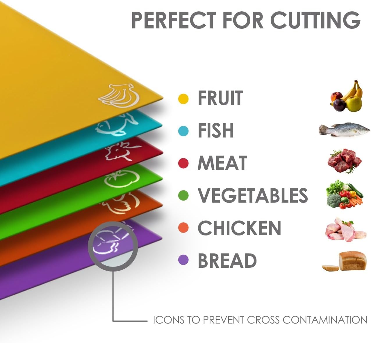 [COLOR-CODED FOR SAFETY]: This 6-piece set includes boards in a variety of colors, reducing the risk of cross-contamination between raw meat, fruits, and vegetables. The color coding keeps meal prep organized and hygienic, making it easy to dedicate each board to a specific food type.