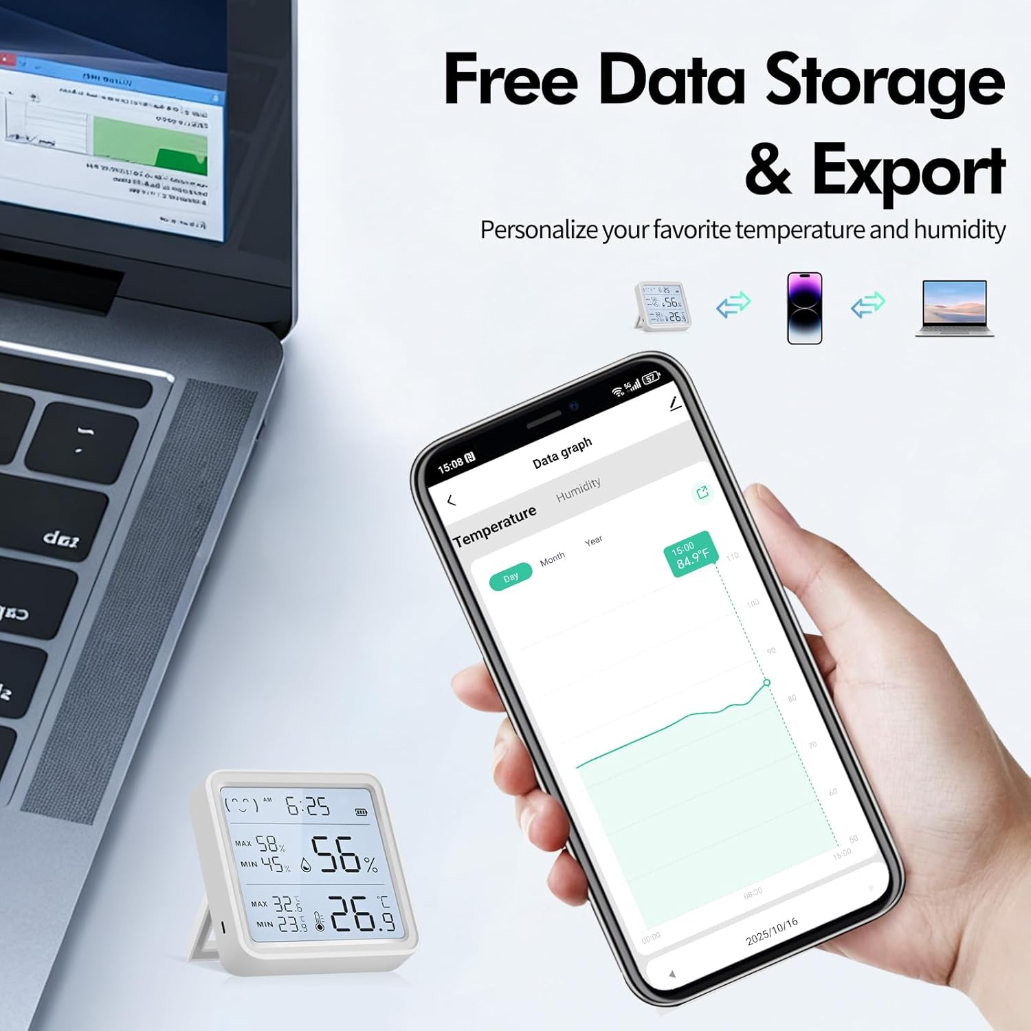 Free Data Storage & Export – Enjoy remote monitoring with the Smart Life APP, including online viewing the temperature and humidity yearly, monthly, daily, or by the hour, and exporting data over the past 1 years. Perfect for home, kitchen, bedroom, greenhouse, wine cellars, basements, etc.