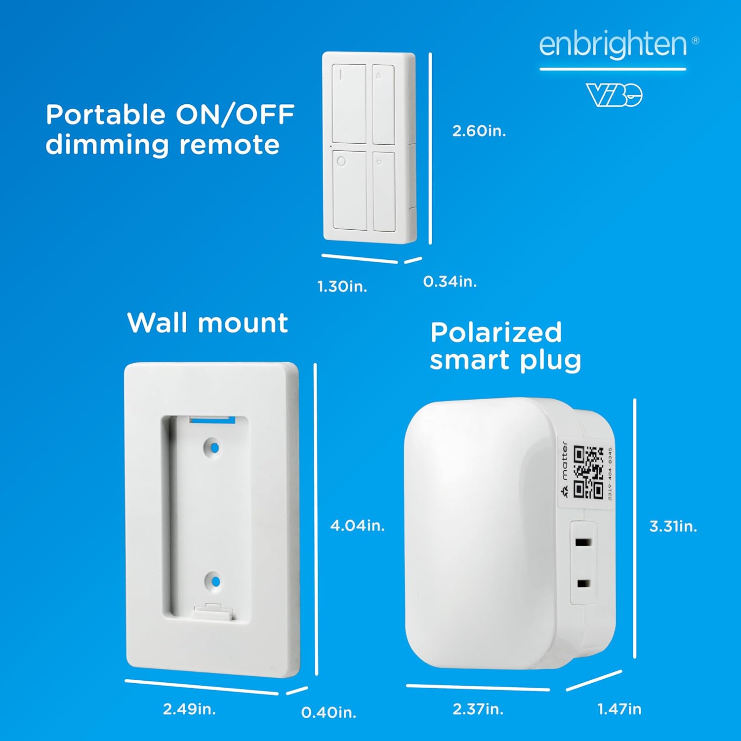 Take full control using the Enbrighten VIBE Wi-Fi Smart Plug with Dimming Remote. Life’s better with options. Whether you prefer using a convenient remote or Wi-Fi control through your phone, operating your lights has never been easier. The smart plug offers unique scheduling, automation and mobile commands through the user-friendly Enbrighten app. When you only need quick ON/OFF control without accessing Wi-Fi, grab the battery-powered remote, which includes a handy wall mount for reliable placement. To further blend into your lifestyle, the smart plug is compatible with any Matter-equipped device. Connect in an instant to experience the joys of automation. One polarized outlet supports your favorite indoor products with two-prong plugs. Additional Enbrighten VIBE remotes and sensors are sold separately and can be paired with the smart plug for even greater control. It’s perfect for upgrading dimmable lamps, decorative lighting, task lights and more. Enhance your operation through the Enbrighten VIBE Wi-Fi Smart Plug with Dimming Remote.