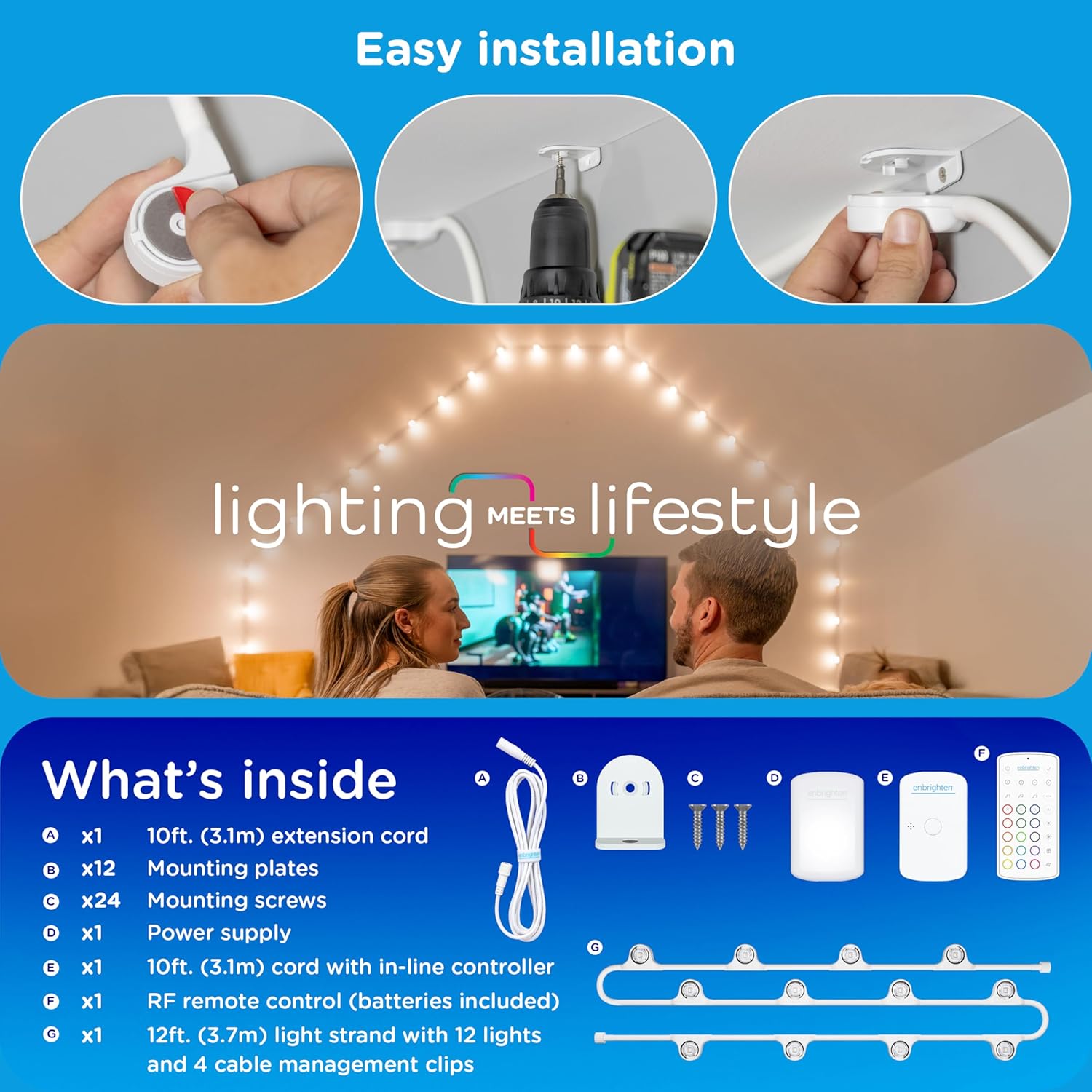 Streamlined and simple lighting controls let you choose how to operate your lights. Pair them to the free Enbrighten app — available in the Apple App Store or on Google Play using a 2.4GHz network or use the remote control or in-line controller. Installation is easy with the included mounting supplies. The premium white cord fits perfectly against flat surfaces and 90-degree corners to blend with your décor. Additionally, the power supply can be connected to either end of the light strand so it’s closest to the nearest outlet.