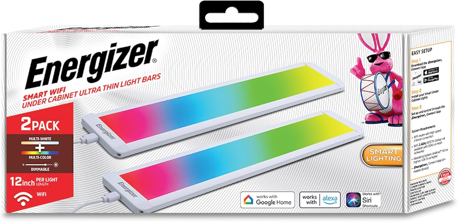 The Energizer 2-Pack Smart Wi-Fi Ultra-Thin Under Cabinet Light Bar brings sleek, modern lighting to your home, with a design that’s as practical as it is stylish. These ultra-thin, 12-inch light bars are only 0.3 inches thick, blending seamlessly into any space while providing powerful, customizable illumination. Offering both RGB and multi-white lighting options, you can choose from millions of colors or warm-to-cool whites to suit any mood, task, or décor. Enjoy the convenience of multiple control options, including the Energizer Connect App, voice assistants like Alexa and Google Home, remote control, touch buttons, and even motion activation for effortless adjustments. Whether you need vibrant lighting for a party or subtle tones for a cozy evening, these light bars adapt to your needs with dimmable brightness and precise color control. Energy-efficient 24V LEDs ensure you get bright, consistent lighting without excessive power consumption.