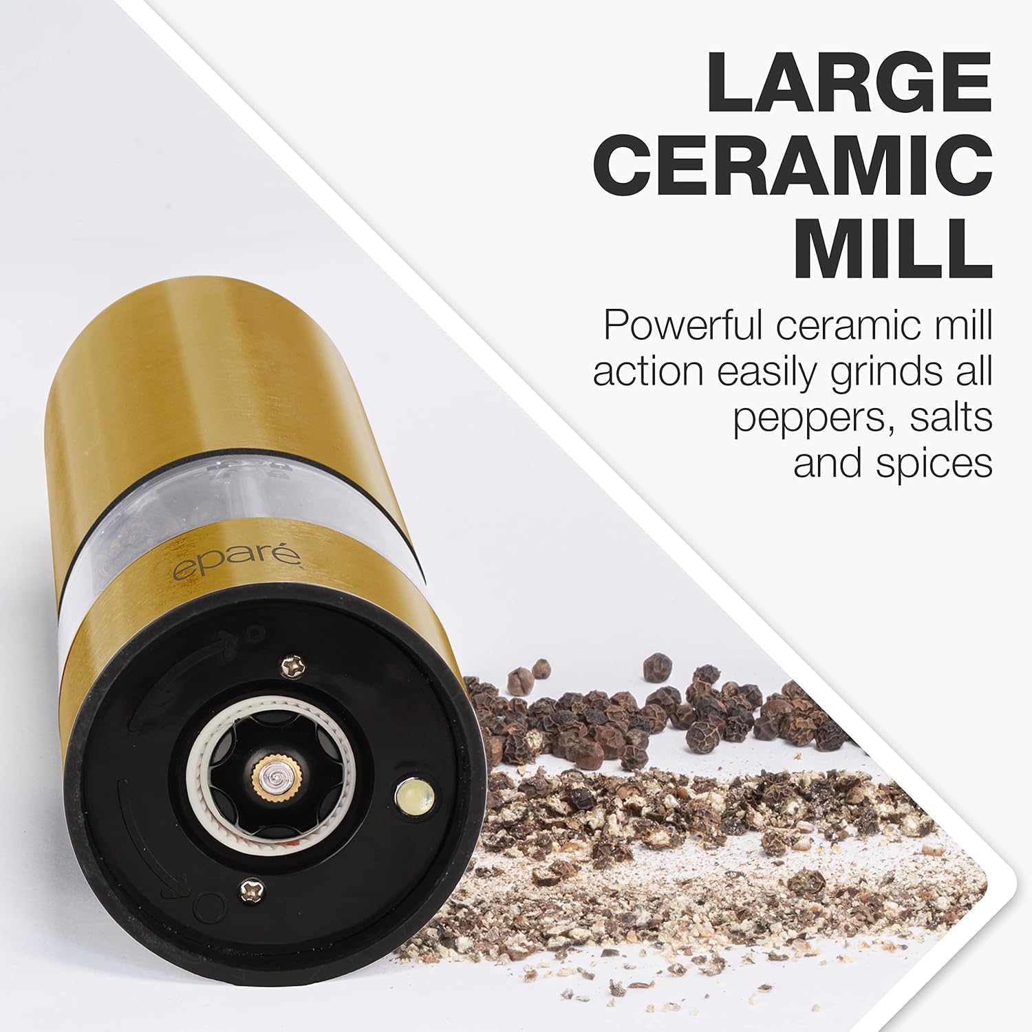 Eparé Trusted Quality: You will receive one (1) Battery Powered Salt or Pepper Grinder measuring 8.75 inches tall and 2 inches in diameter. Weighs 12 ounces. Takes 4 AA batteries (not included) & (4) colored cutting boards measuring 12x15x0.1inch, perfect to cut your favourite meat and veggies without dangerously sliding. They are durable for many years of slicing and dicing, backed by Eparé Guarantee.