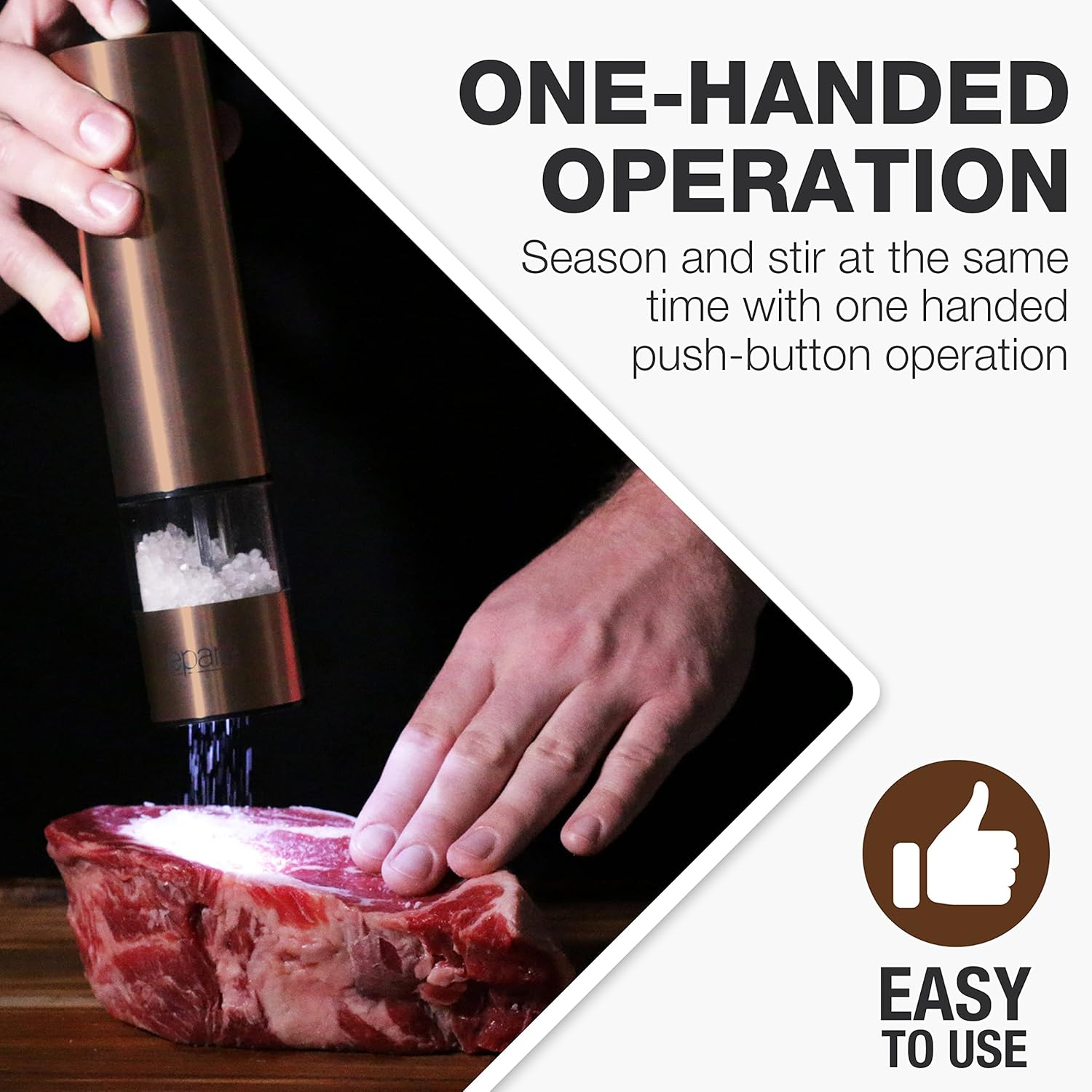 One-Handed Operation: Unlike other manual pepper grinders, this battery operated electric black pepper grinder enables one-handed operation so you’ll have a free hand for stirring. Simply push top button of** grinder. Helpful to arthritis sufferers.