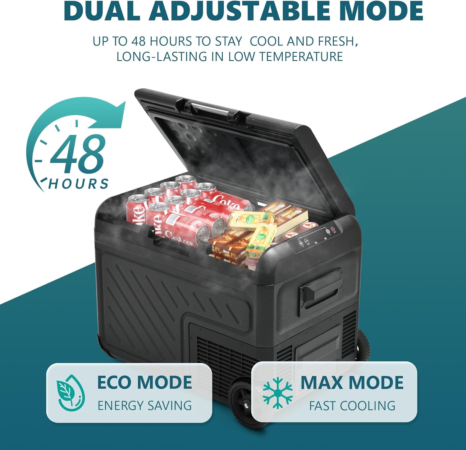 Fast Cooling & Low Energy Consumption; The portable electric cooler freezer is equipped with a high-efficiency compressor that rapidly cools from 50°F to 32°F in just 15 minutes. The portable freezer is UL certified for energy efficiency, featuring an ECO mode for energy savings and a MAX mode for rapid cooling, with an average energy consumption of just 45W
