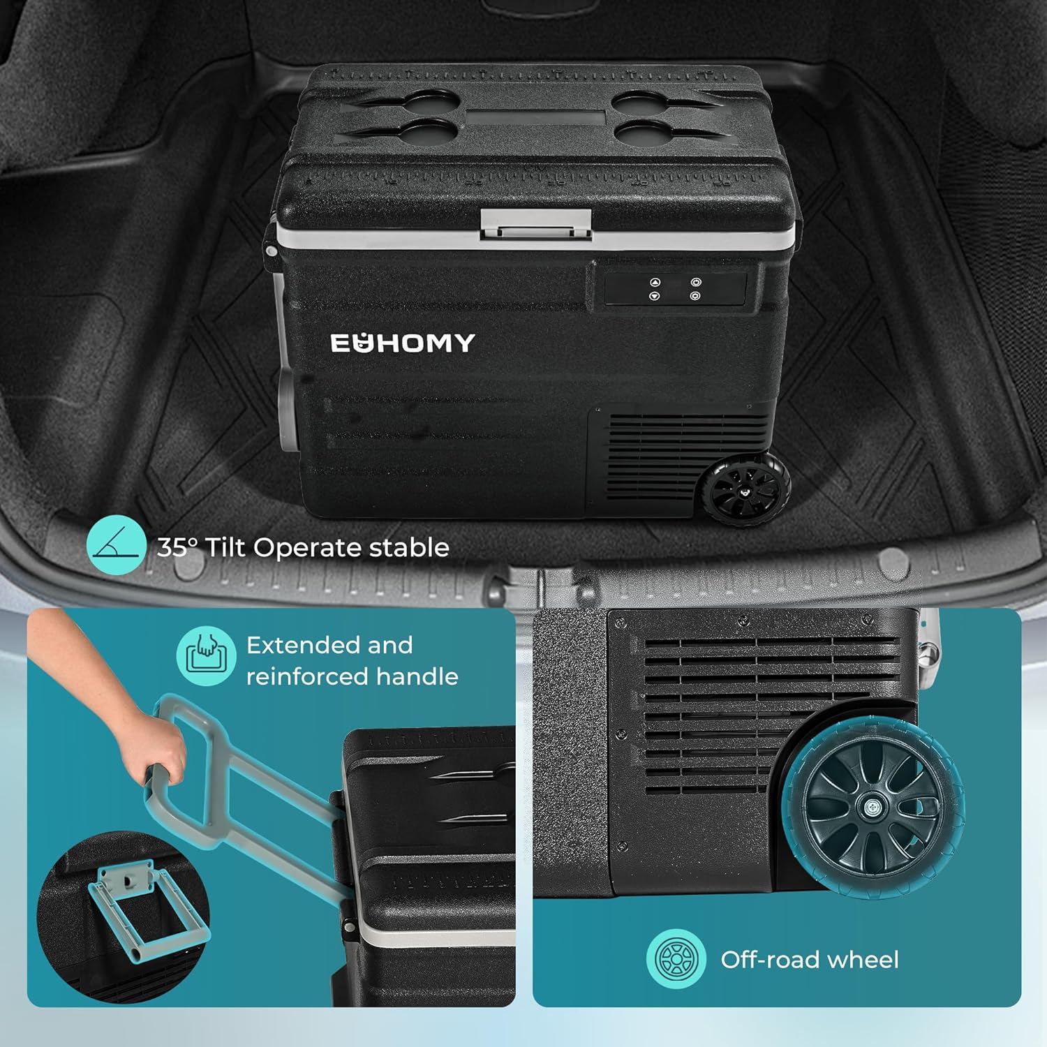 【Large Volume &LCD Panel】Euhomy 59 quart 12 volt car refrigerator has a large volume, can store all kinds of food according to your needs, no partition design is more convenient to store large food, large space to store your various foods, even a whole sea fish! The temperature range is wide, and through the LCD panel you can adjust it as a refrigerator or freezer. The 12 volt car fridge is equipped with a simple LCD control panel, which allows you to control the temperature you need.
