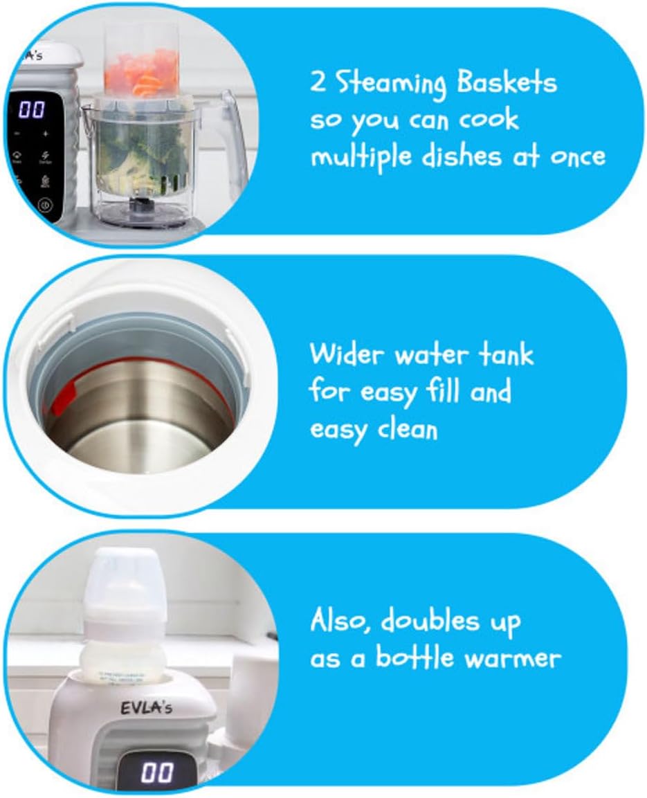 EVLA’S Double Baby Food Maker with 2 Steaming Baskets, Steamer, Blender, Grinder, Food Processor, Cook & Blends Healthy Baby Food in Minutes, Touch Screen, with 6 food pouches, White