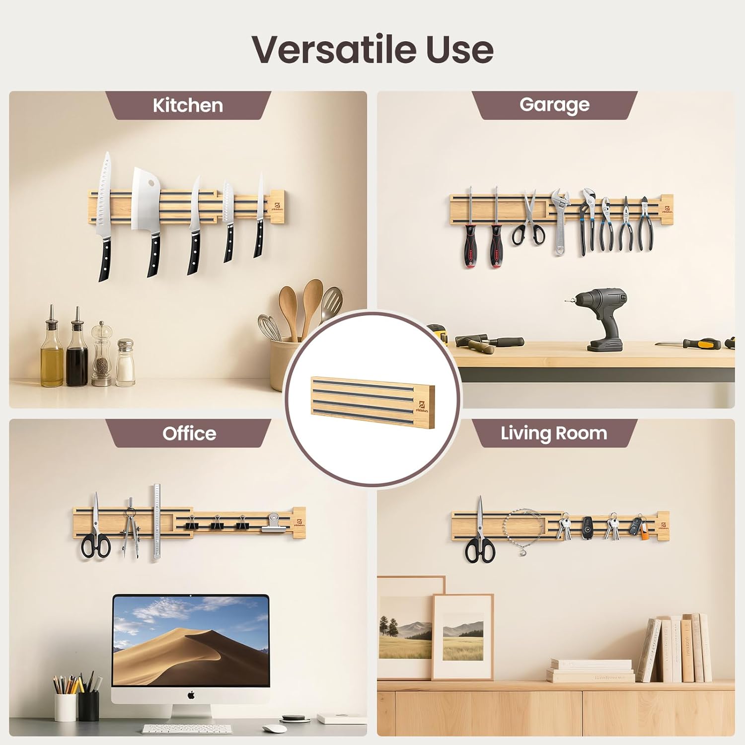 Versatile Magnetic Strip for Every Space: Revolutionize your organization with this magnetic knife holder! Perfect for homemakers, chefs, and DIY enthusiasts, it keeps everything from heavy cleavers, chef’s knives, scissors, spatulas, whisks, and tongs neatly accessible in the home kitchen. In garages or tool room, it securely holds hammers, screwdrivers, wrenches, pliers, and saw blades. Perfect for dorms, apartments, laundry rooms, utility rooms, office, restaurants, RVs, workshops, and even boats, ensuring every item stays in place.
