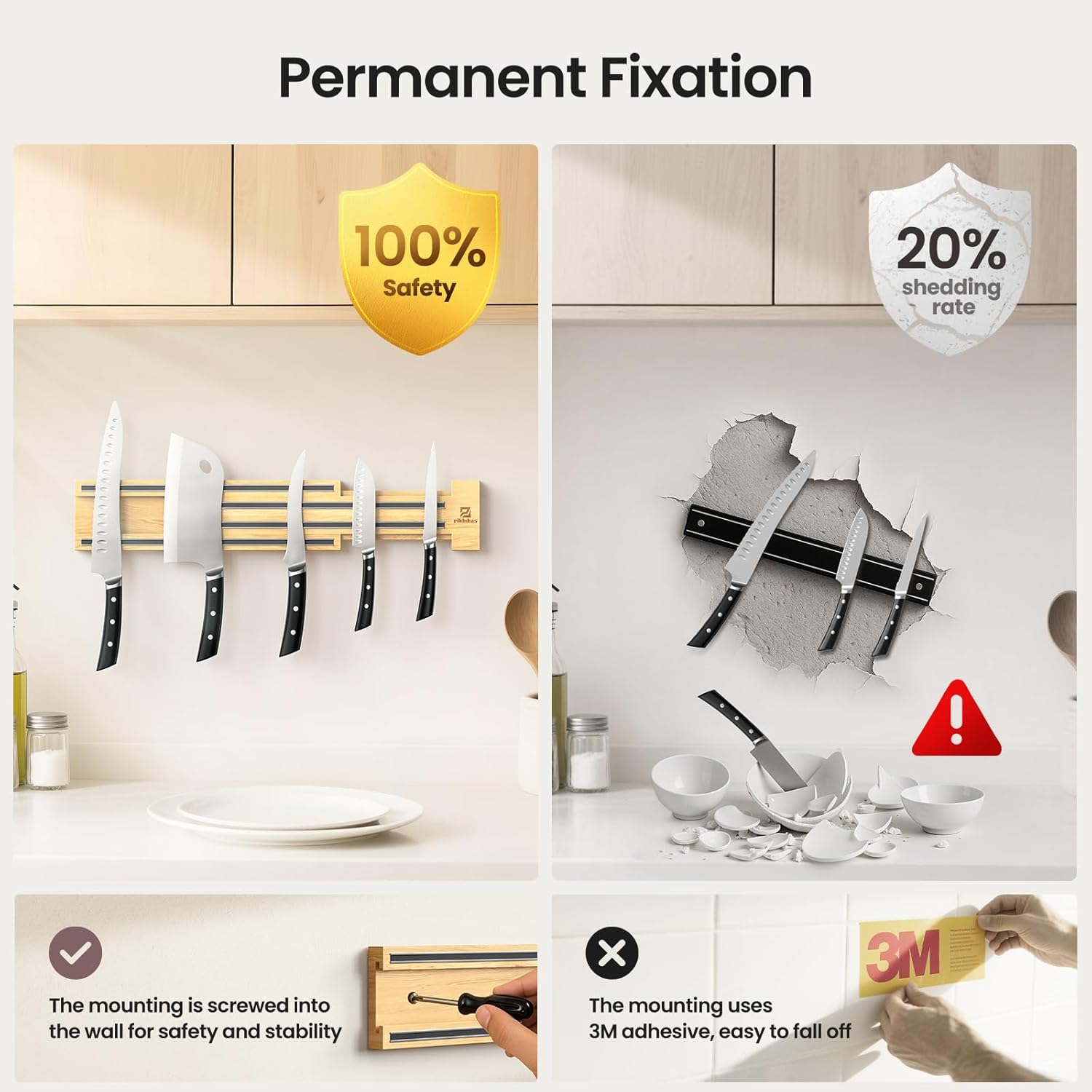 A Better Alternative to Knife Blocks: Ditch bulky kitchen knife blocks! Traditional blocks waste valuable counter space, while storing knives in drawers makes them hard to find and damages blades from constant rubbing. Our wall-mounted magnetic utensil holder keeps knives visible, moisture-free, and easily accessible. Free up space and streamline meal prep with this clutter-free solution.