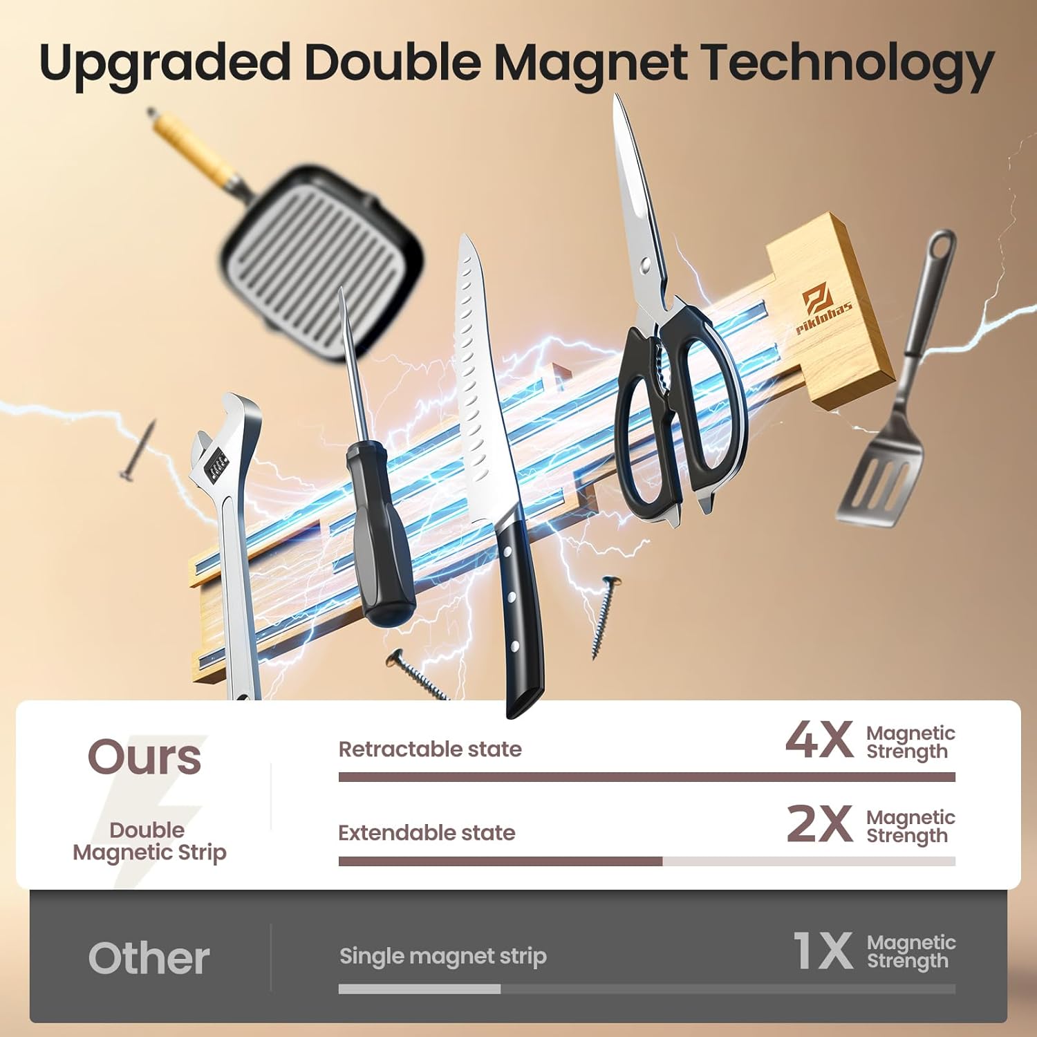 Enhanced 2-4x Magnetic Strength: Piklohas heavy duty kitchen knife holder features dual-row magnets twice as strong as standard magnetic strips, ensuring that knives stay securely in place without slipping. When fully Compressed, it becomes a 4-row magnet strip, instantly doubling the magnetic strength, effortlessly holding heavier items like frying pans and other large metal tools.