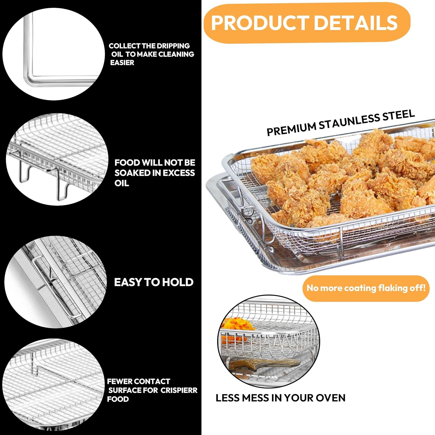 [Easy Cooking with Mess Free Kitchen]: This stainless steel air fry basket for oven is easy to use, simply place your food in the mesh basket, set the cooking time and temperature. The air fryer rack for oven is ideal for catching grease and crumbs to avoid messing your oven. The easy-grip handles make removing food from the oven simple and effortless, providing a convenient and efficient cooking experience.
