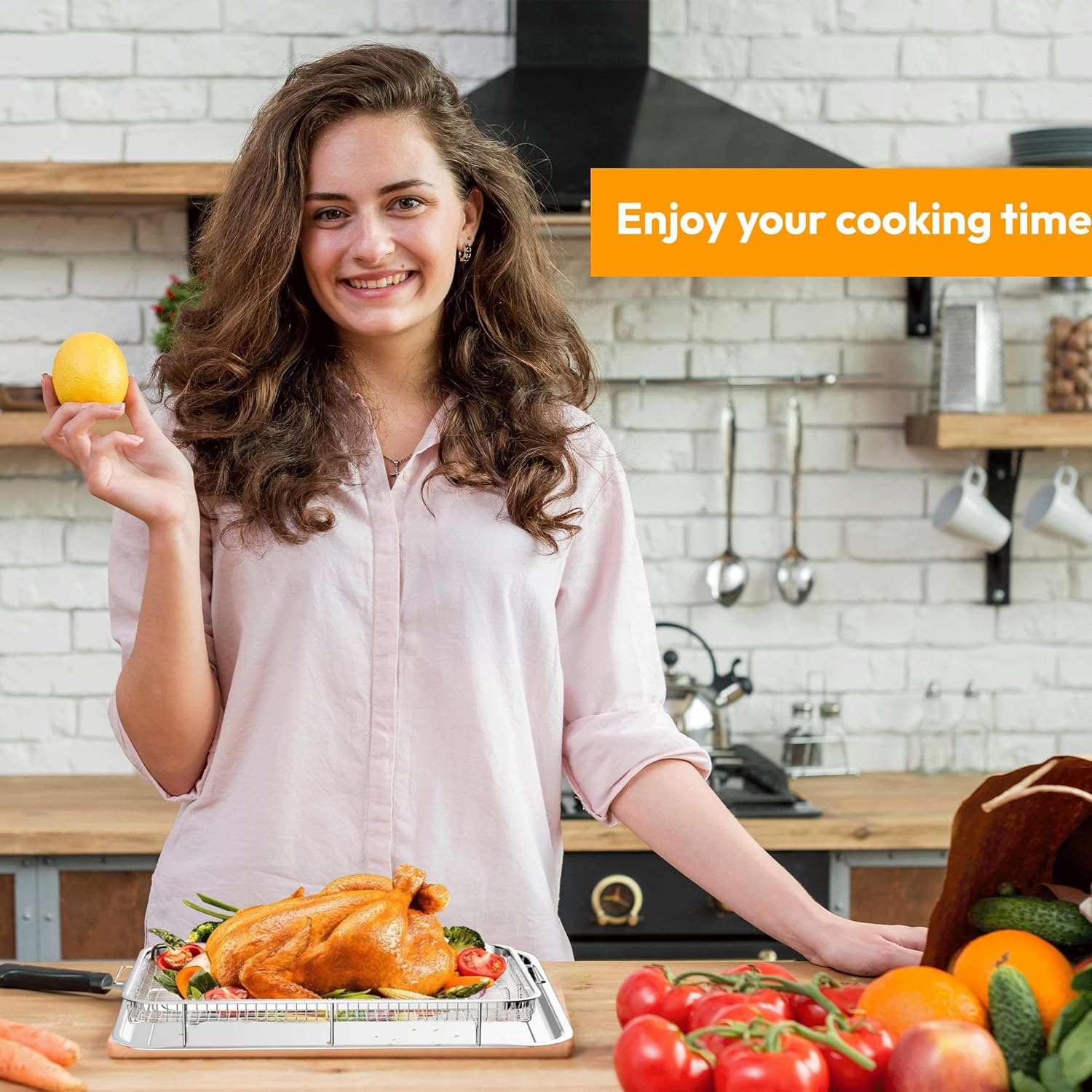[Extra Large Size for Families and Gatherings]: Our air fryer stainless steel basket measuring 18.8″ × 12.8″ inches, allows you to cook more food at once from crispy fried chicken to roasted vegetables. Whether it’s family dinners or entertaining guests, this air fryer pan for oven makes meal faster and more efficient.