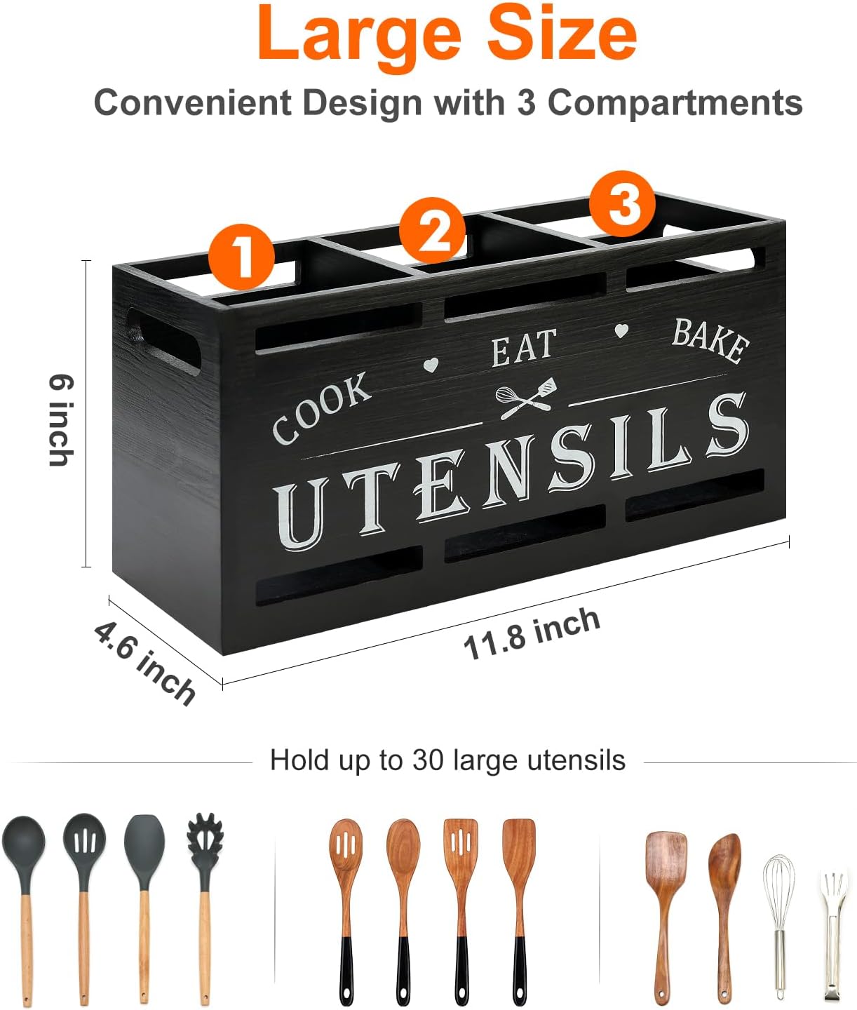 Large Wooden Utensil Holder: Made from solid natural wood, this extra-spacious organizer (11.8″L x 4.6″W x 6″H) comfortably stores all your essential cooking tools while holding up to 30 large utensils. Helps you create more space for kitchen tools!