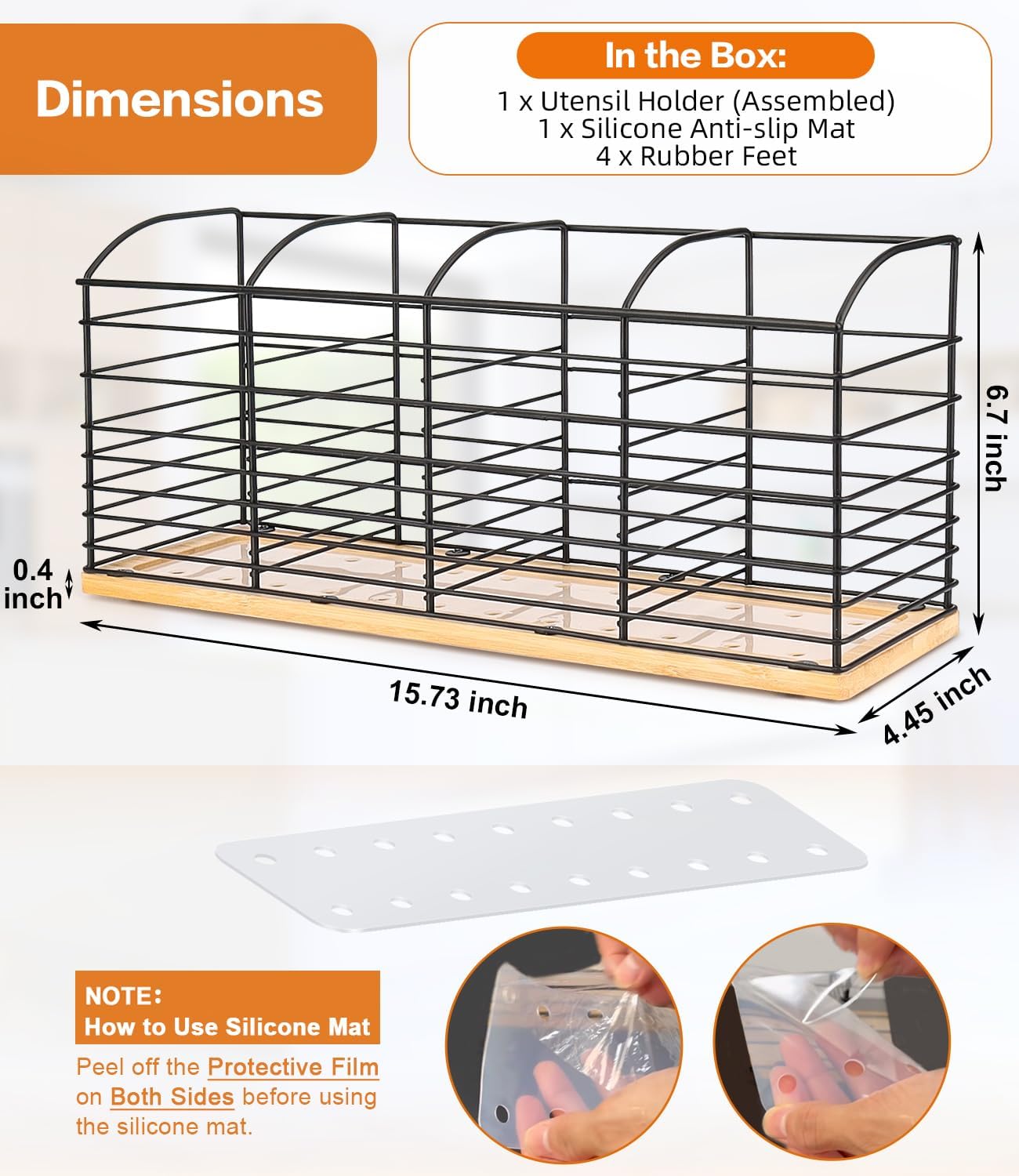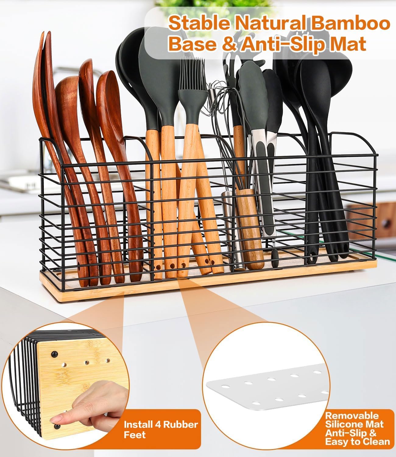 NON-SLIP MAT & STABLE BAMBOO BASE: The Anti-Slip mat prevents the utensils from slipping. The sturdy metal material and premium thick bamboo base ensure that this utensil caddy stays in place without slipping or tipping. Weighing 1.8 lbs., this steel bamboo kitchen counter organizer provides excellent stability. Additionally, four non-slip pads on the base of this cooking utensil holder protect your countertop from scratches.