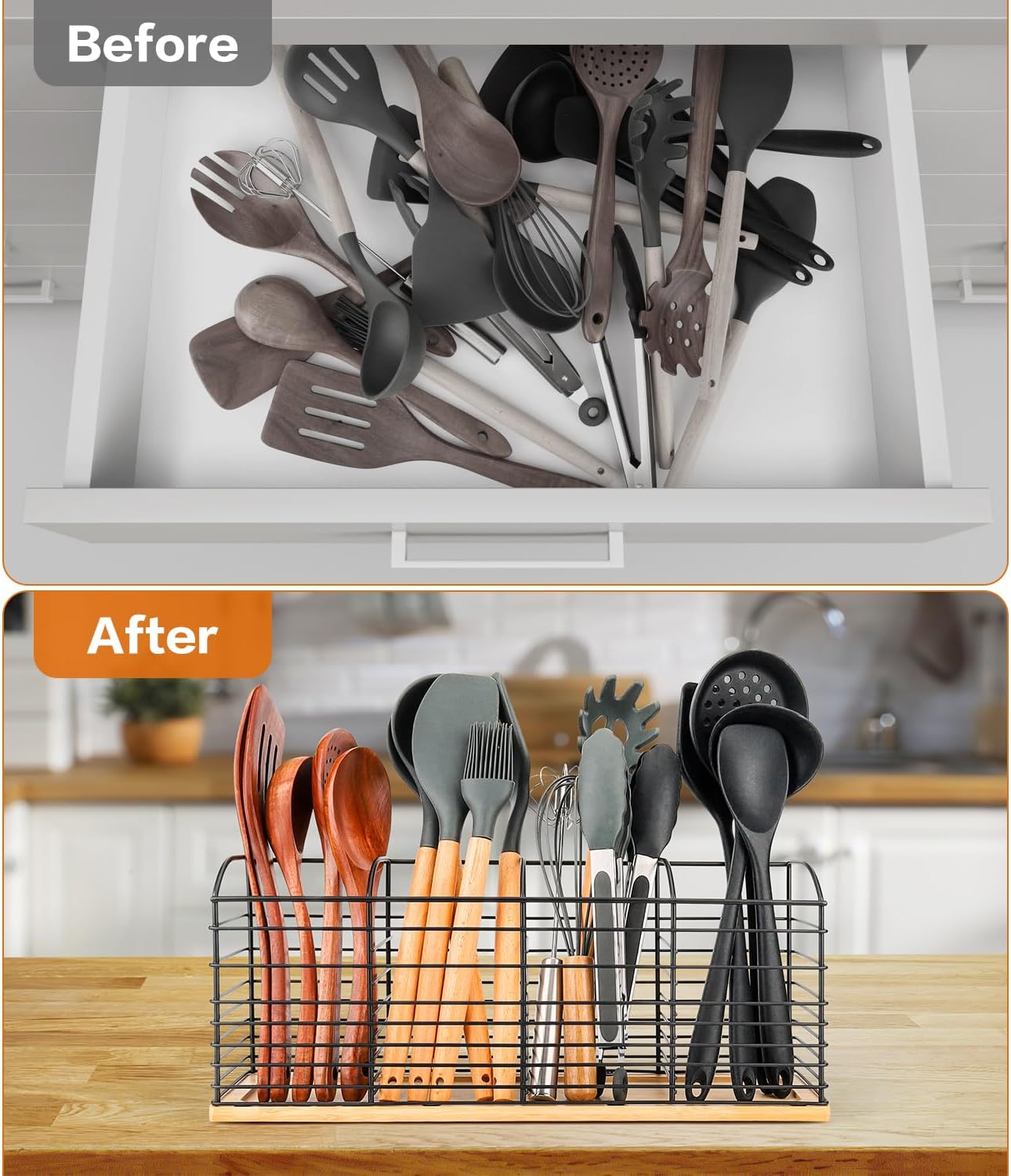 STURDY CONSTRUCTION, LASTS FOR YEARS: Crafted from rust-resistant steel and premium bamboo, this utensil holder for the kitchen counter is built to withstand everyday use. Its heavy-duty construction ensures durability for years to come.