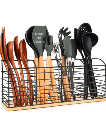 VERSATILE USES: With its wide-opening wire design and solid bamboo base, this kitchen utensil holder offers a perfect platform for storing all your larger cooking utensils such as spatulas, ladles, whisks, tongs, servers, and turners. Maximize your countertop space with this convenient utensil organizer. Apart from kitchen utensil storage, this black utensil holder can also be used for storing cutlery, office supplies, craft supplies, and more.