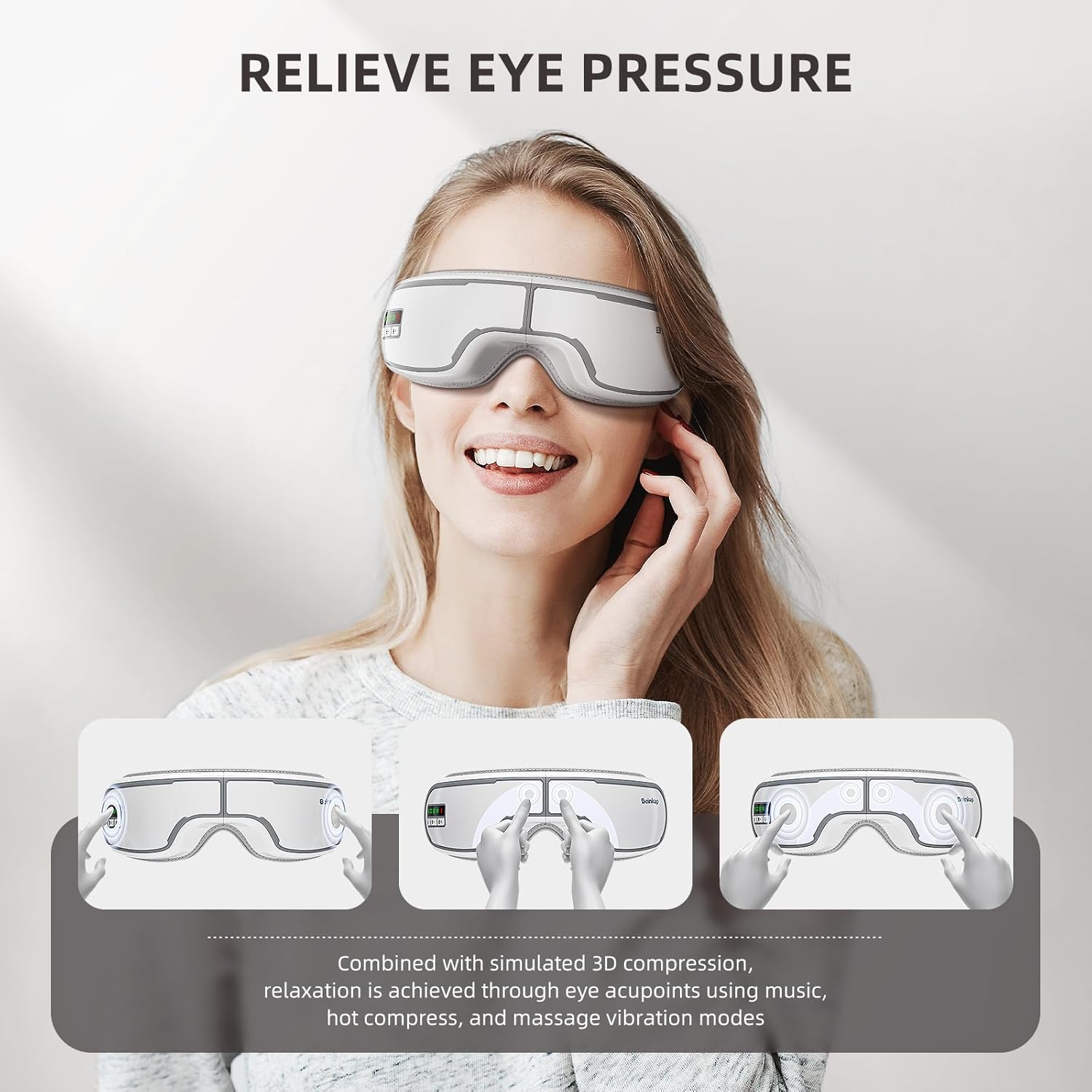 Customers find the eye massager provides excellent relaxation, particularly for headaches and eye strain after long days, and appreciate its built-in music that adds to the soothing effect. Moreover, the device is easy to use, with Bluetooth connectivity to phones, and features different massage modes and adjustable heat levels. Customers praise its lightweight design, build quality, and value for money, with one customer noting it lasts for years.