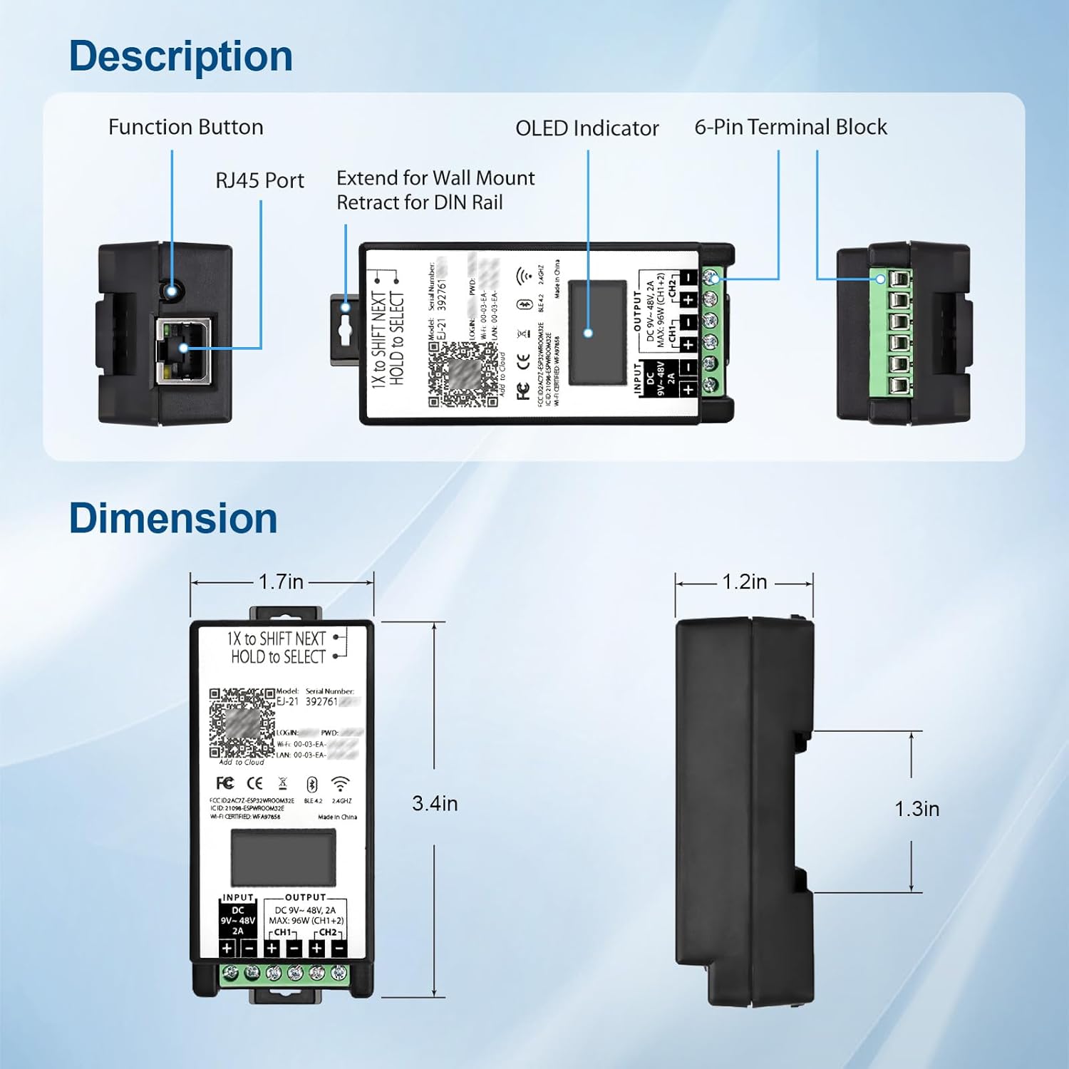 Model # EJ-21 Din Rail Specification: 1.TS-35/7.5/1.0 2.TS-35/15/1.5 3.DNR274 4. DNR314 5.DNR315 Function Button Press & Hold = Execute Selection / Press 1x = Goto Next Option Network Access 1.Ethernet 10/100 Base-T 2.Wi-Fi 2.4Ghz (802.11b/g) 3.Bluetooth BLE v4.2 Power Metering 1.Individual Channel Metering 2.Current (±2.0% ±0.1A) 3.Voltage (±2.0% ±0.1V) 4.Power (±2.0% ±0.1W) 5.Note: All values are for reference only. Electrical Rating Input: DC 9V~48V, 2A Output: DC 9V~48V, 2A (CH1 + CH2) MAX 96W. IP Support Android APP / iOS APP / Microsoft Edge / Chrome / Java / Safari browser Certification FCC ID (USA), NCC (Taiwan), KCC (Korea), CE (Europe), CMIIT ID (China), ISED ID (Canada), MIC (Japan) Operating Temperature 0°C ~ 70°C at 10% ~ 90% relative humidity. For indoor use only. Package Dimension 70 x 40 x 110 mm Package Includes 1.ezJack-2R 2.device Quick Installation Guide 3.LAN cable