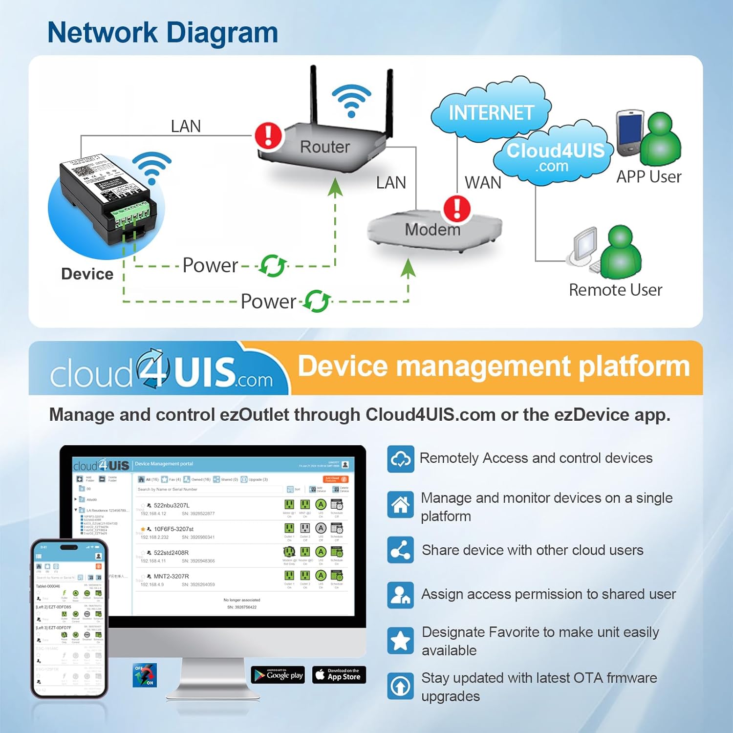 APP & CLOUD SUPPORT: Compatible with iOS and Android via the ezDevice App or Cloud4UIS.com for remote operation.