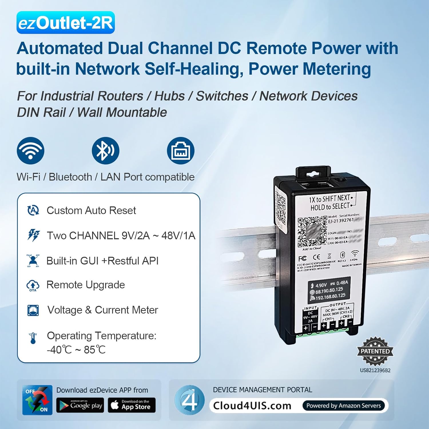 DUAL CHANNEL CONTROL: Features two individually controllable DC channels (9V-48V, 2A) accessible via LAN or Cloud, perfect for managing multiple network devices simultaneously
