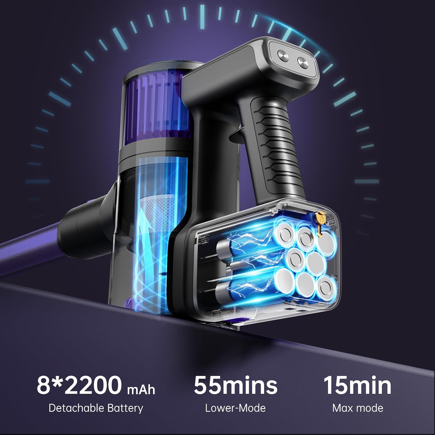 【8*2200mAh Battery Up to 55 Mins Runtime】: Stick vacuum cordless rechargeable expands the detachable battery capacity to 8 x 2200mAh, you can charge the built-in vacuum cleaner or a separate battery, which can be fully charged in 4-5 hours quickly & Conveniently. Three modes of this stick vacuum cleaner can be choosed: Eco (12 kPa, 50-55 minutes), Standard (20 kPa, 20-25 minutes), Strong (38 kPa, 10-15 minutes).
