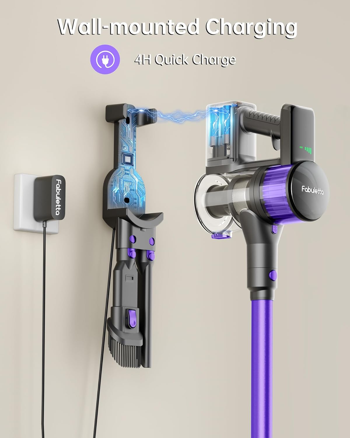 【Wall-Mounted Charging Dock】: Fabuletta vacuum comes with an upgraded wall-mounted charging dock—just place it on the bracket for automatic charging. No more hunting for the charger! (Note: Connect the original charger to the dock.) Also you can detach the battery to charge separately, or keep the vacuum cleaner on the wall dock for automatic charge and storage.