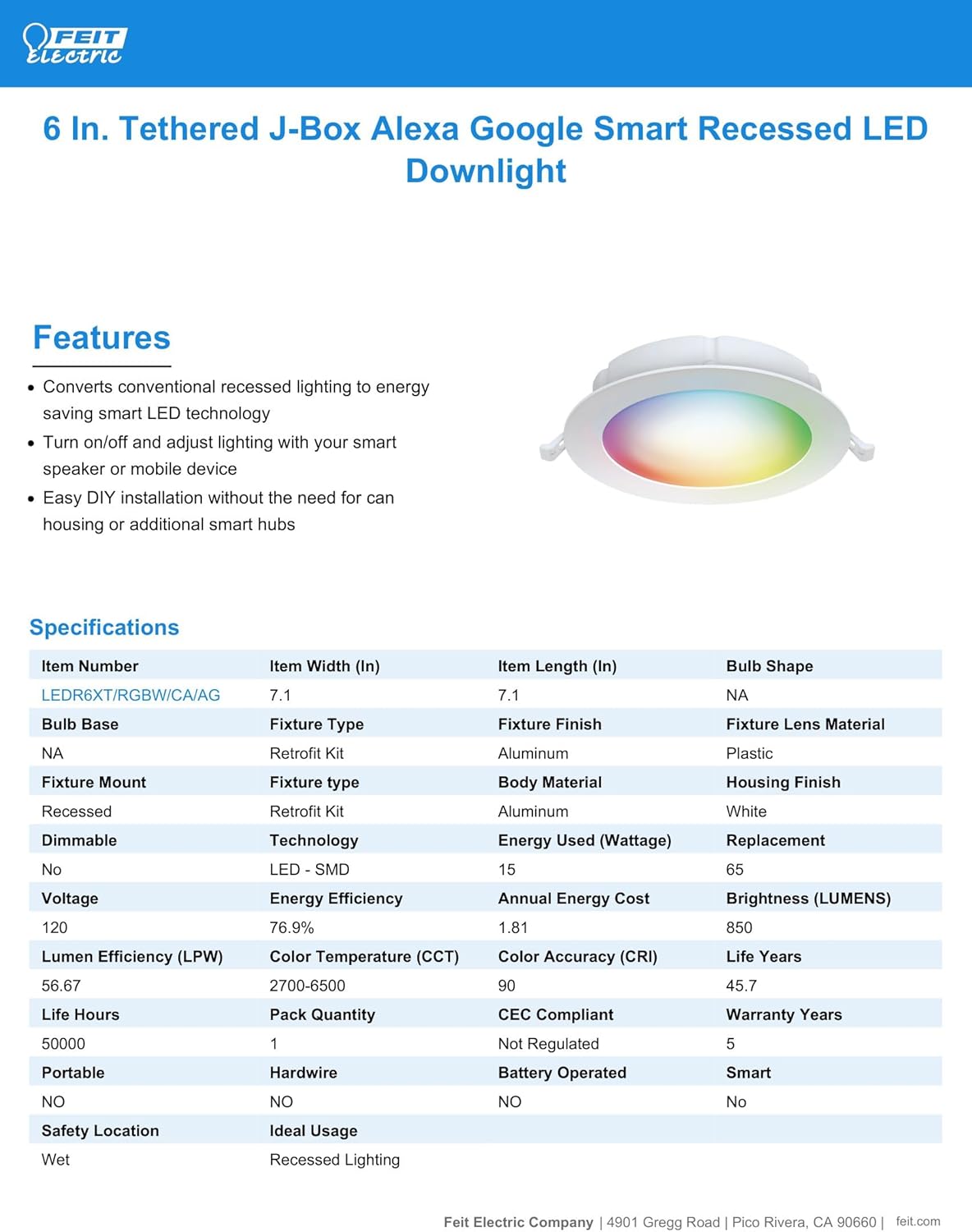 Convert your old recessed downlights to advanced LED energy-saving technology with the LEDR6XT/RGBW/CA/AG smart recessed downlight from Feit Electric. Fitting most 6 inch recessed can housings, this dimmable color-changing light produces 850 lumens using only 15 watts – up to 84% less energy than an equivalent 65 watt incandescent. A 90+ CRI makes colors vibrant and skin tones look more natural, all while saving energy and lasting for decades. These smart canless recessed lights connect directly to your 2.4GHz WiFi at home, allowing control over color, dimming, schedules and more with an intuitive mobile app, or your Alexa or Google device. Use your favorite mobile device or Alexa / Google / Siri smart assistants to easily turn lights on/off, dim, set groups and schedules from anywhere. Choose energizing daylight or wind down with relaxing soft white light. Get creative with color, it’s all up to you. This innovative recessed downlight comes with a tethered J-Box and built-in trim for installation directly into finished ceilings without recessed cans.