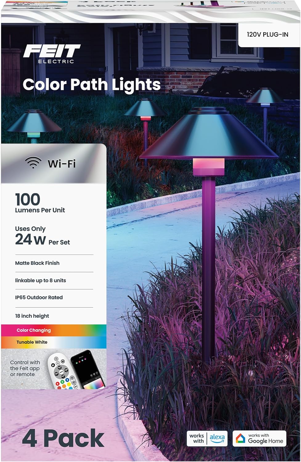 Upgrade your outdoor ambiance with Feit Electric’s Smart Path Lights (4-Pack). These path lights seamlessly blend classic design with cutting-edge features. Enjoy independent color control, choosing a single color or tunable whites for each light. Want a party atmosphere? Sync the lights to your music for dynamic color displays. Control them from anywhere with the Feit Electric App or use the included remote for on-the-spot adjustments. Set automated schedules for nighttime safety or customize lighting scenes to fit your mood. Their durable wet-rated metal construction ensures year-round use. They boast 2.4GHz Wi-Fi and Bluetooth connectivity for flexible setup, and each light delivers 100 lumens of brightness. Voice control compatibility with Alexa and Google Home lets you command the lights hands-free. This 4-pack is perfect for walkways, and you can link up to 8 lights on a single power source for larger areas.